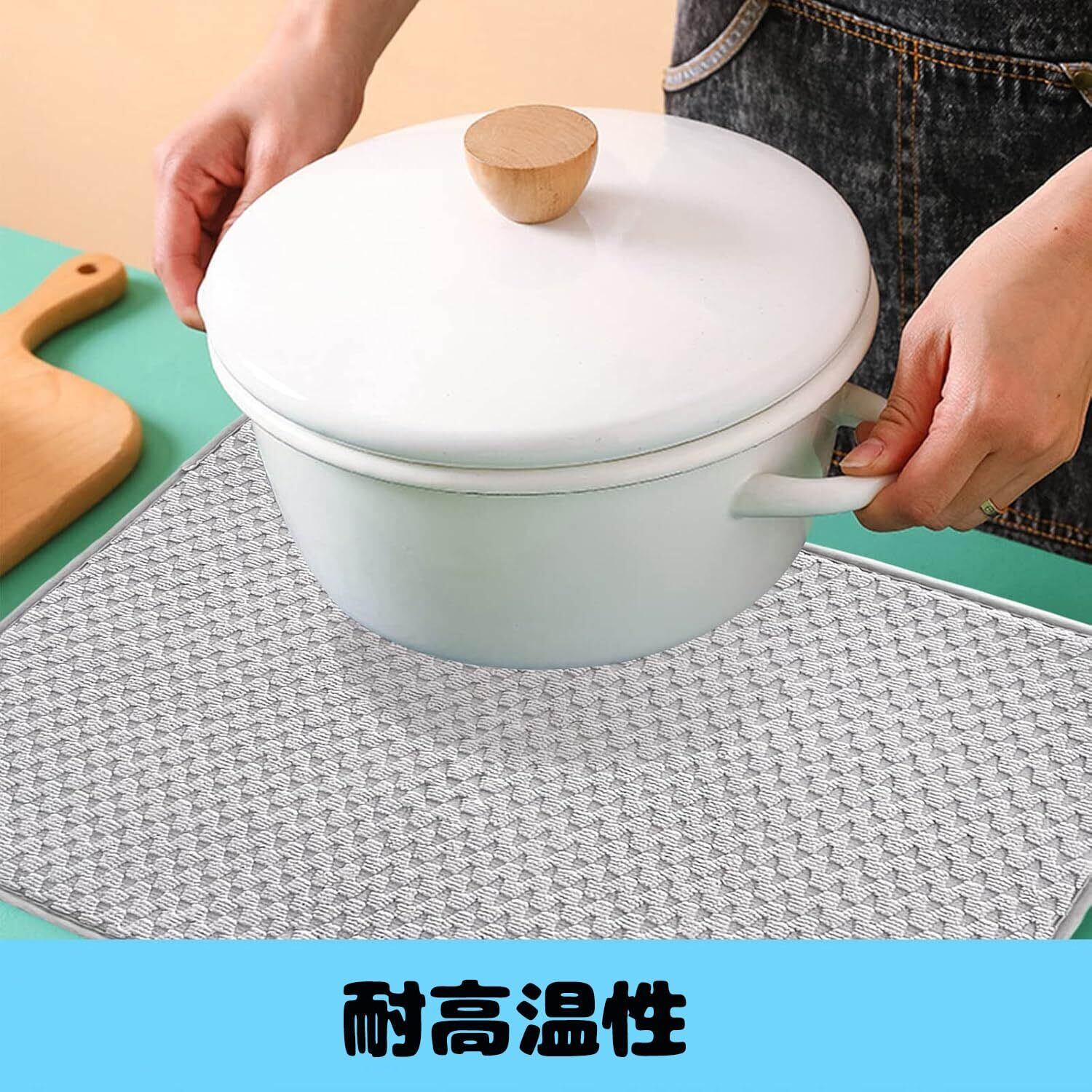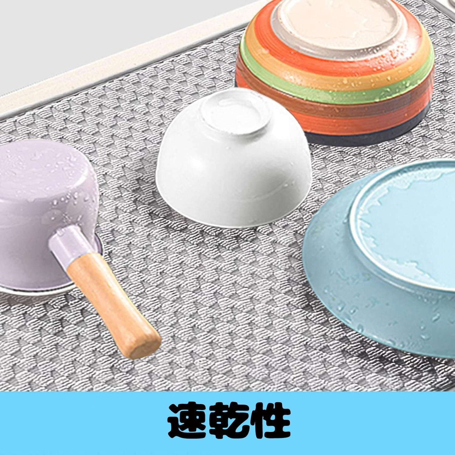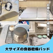 【高吸水性】高吸水性のマイクロファイバー素材を使用しており、食器を洗ったあと、そのままマットに置くだけで素早くしっかりと水分を吸収します。洗った食器を置けばしっかり水分を吸収してくれて、拭く必要もなく、食器が早く乾きます。大きなマットなので、洗ったお皿が大きかったり、多くても、しっかり置けるのも特徴です。