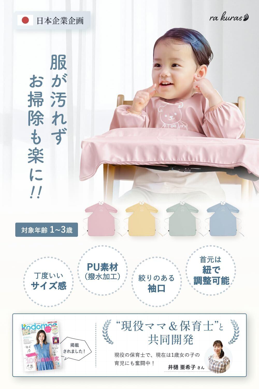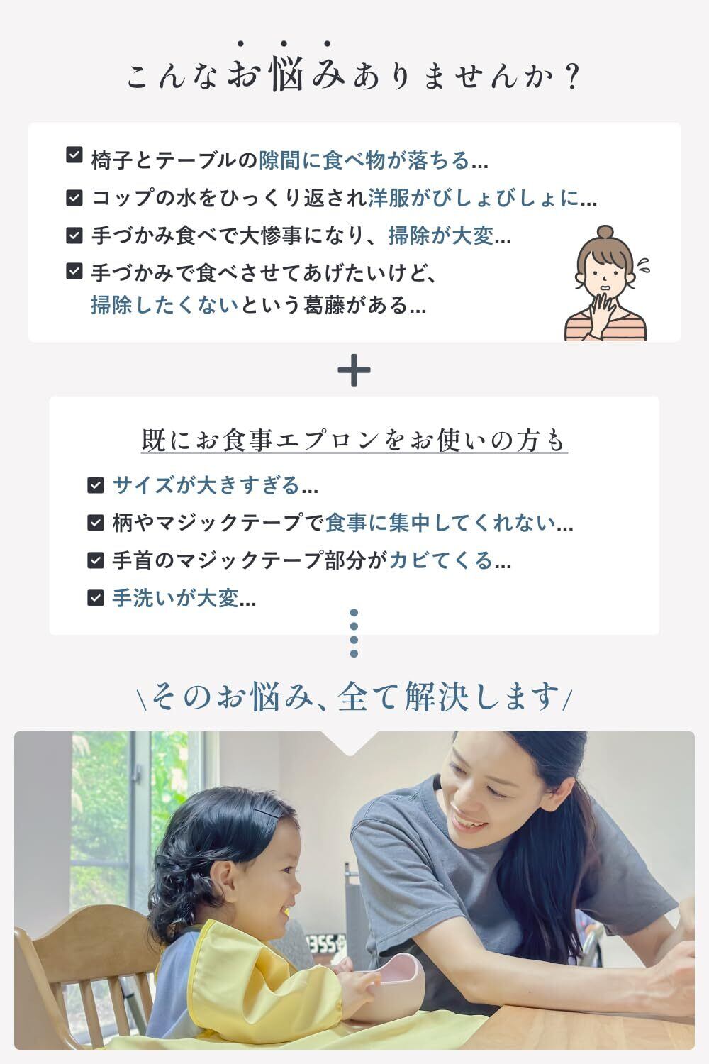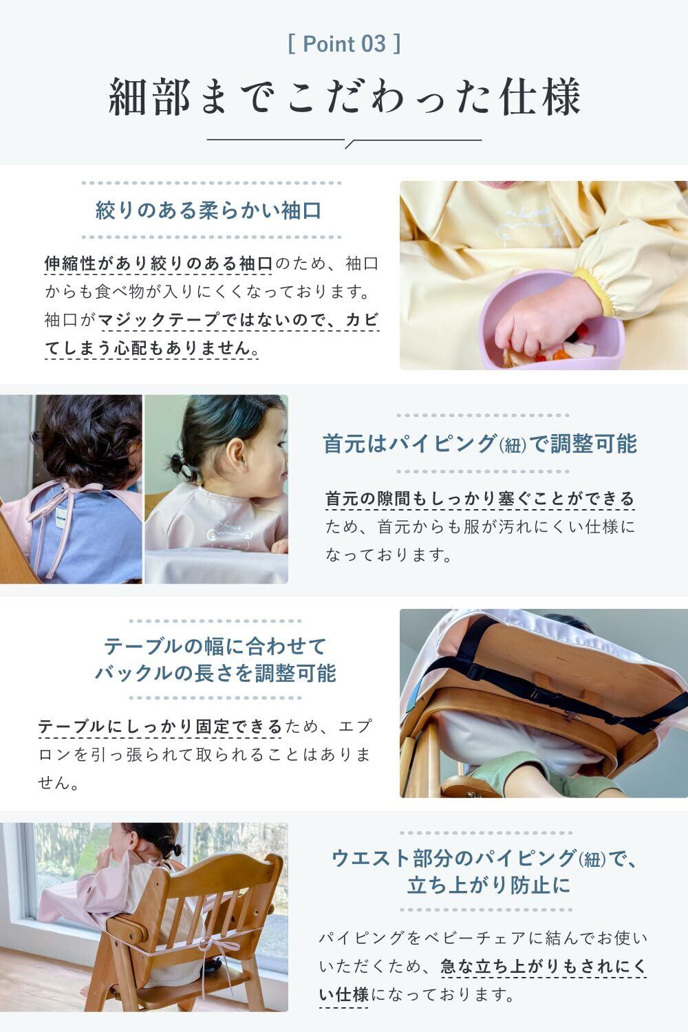 【絞りのある柔らかい袖口】 伸縮性があり絞りのある袖口のため、袖口からも食べ物が入りにくい仕様になっております。 袖口がマジックテープではないため、カビる事はもありません。