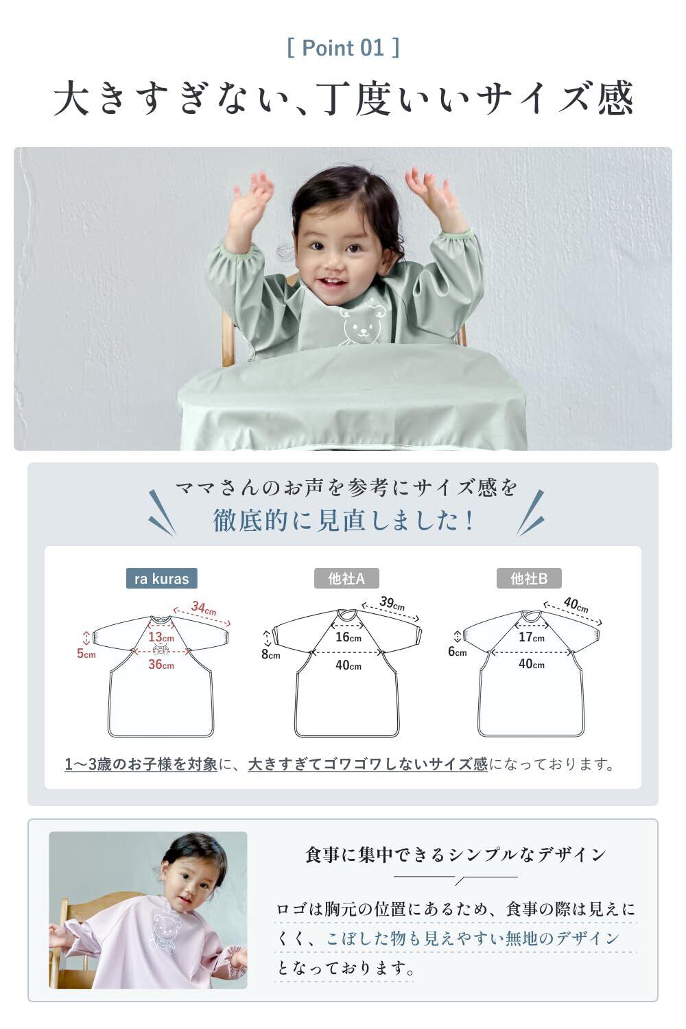 【大きすぎない、丁度いいサイズ感の設計】 1〜3歳位のお子様を対象に、大きすぎてゴワゴワしないサイズ感を目指し、着心地が良い生地を採用しました。