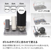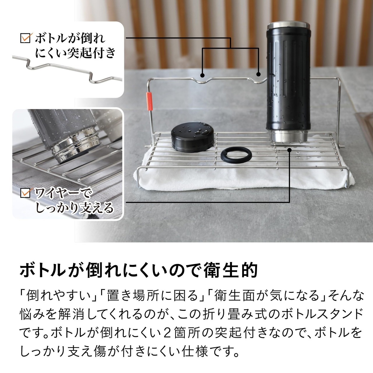 ボトルの同部分を支える突起が、倒れにくい状態を実現します。大きめのタンブラーでも安心して置けるため、朝のコーヒー後の片付けもストレスフリー。乾燥時間も短くなり、次に使いたいときにすぐ手に取れます