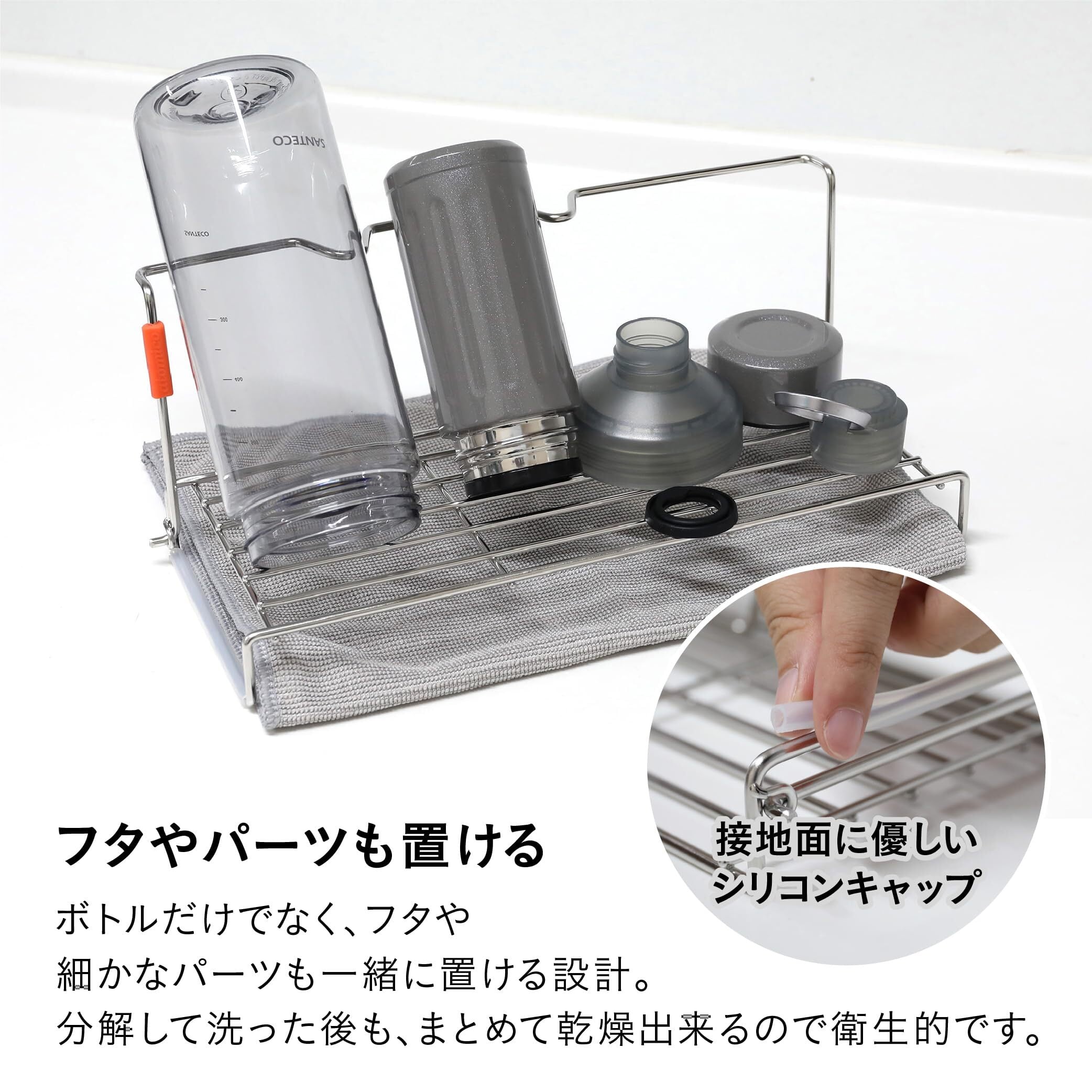 置き場所に困るキャップやパッキンなど、全部まとめて乾かせるので仕分ける手間もなく、後片付けの時間を短縮できます。スタンドの下に布巾を敷いておけば、滴る水もしっかり吸水。専用の水受け不要で、お手入れもカンタンです