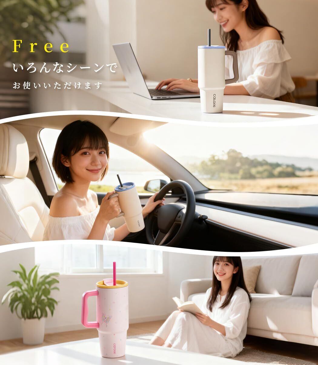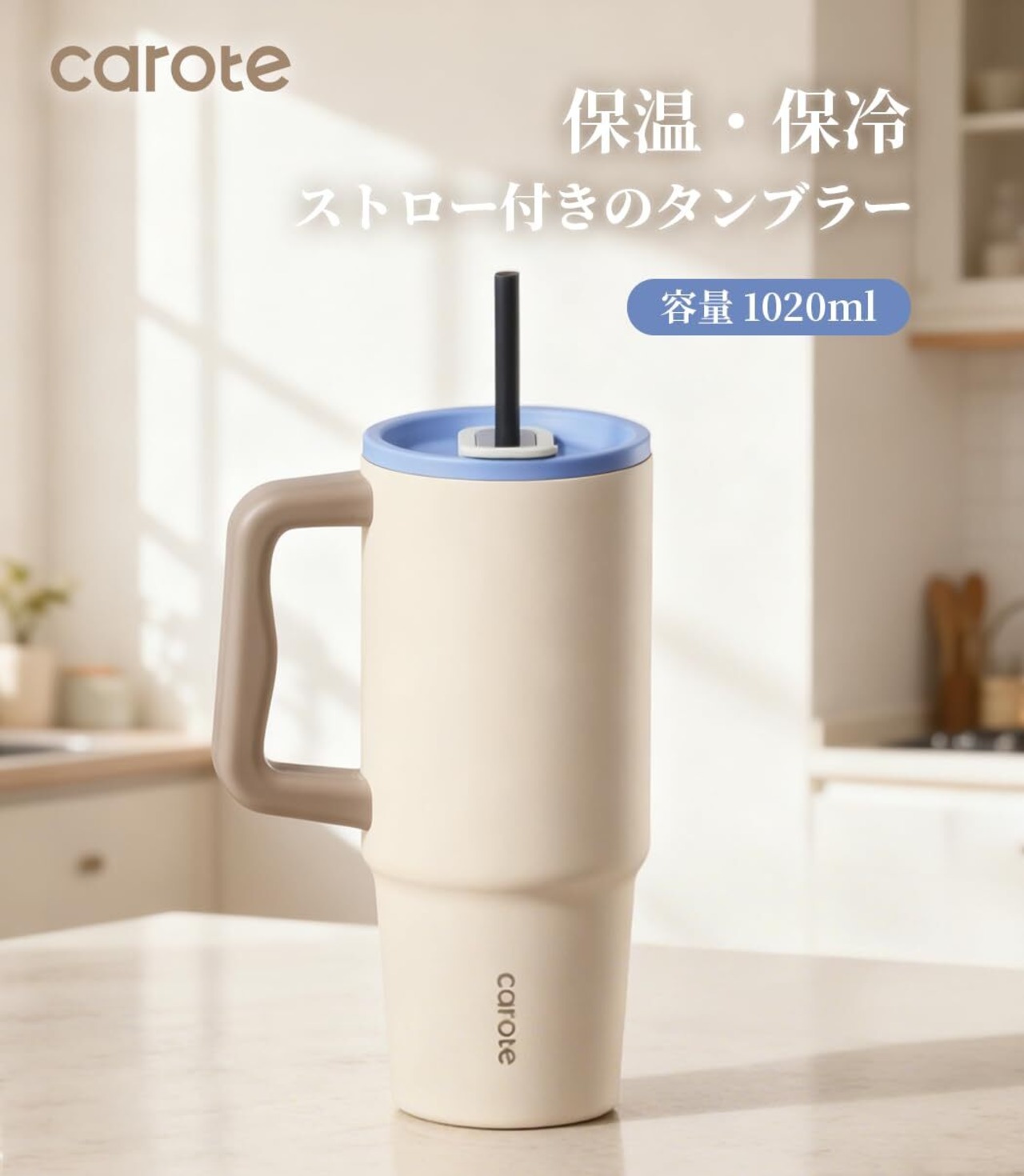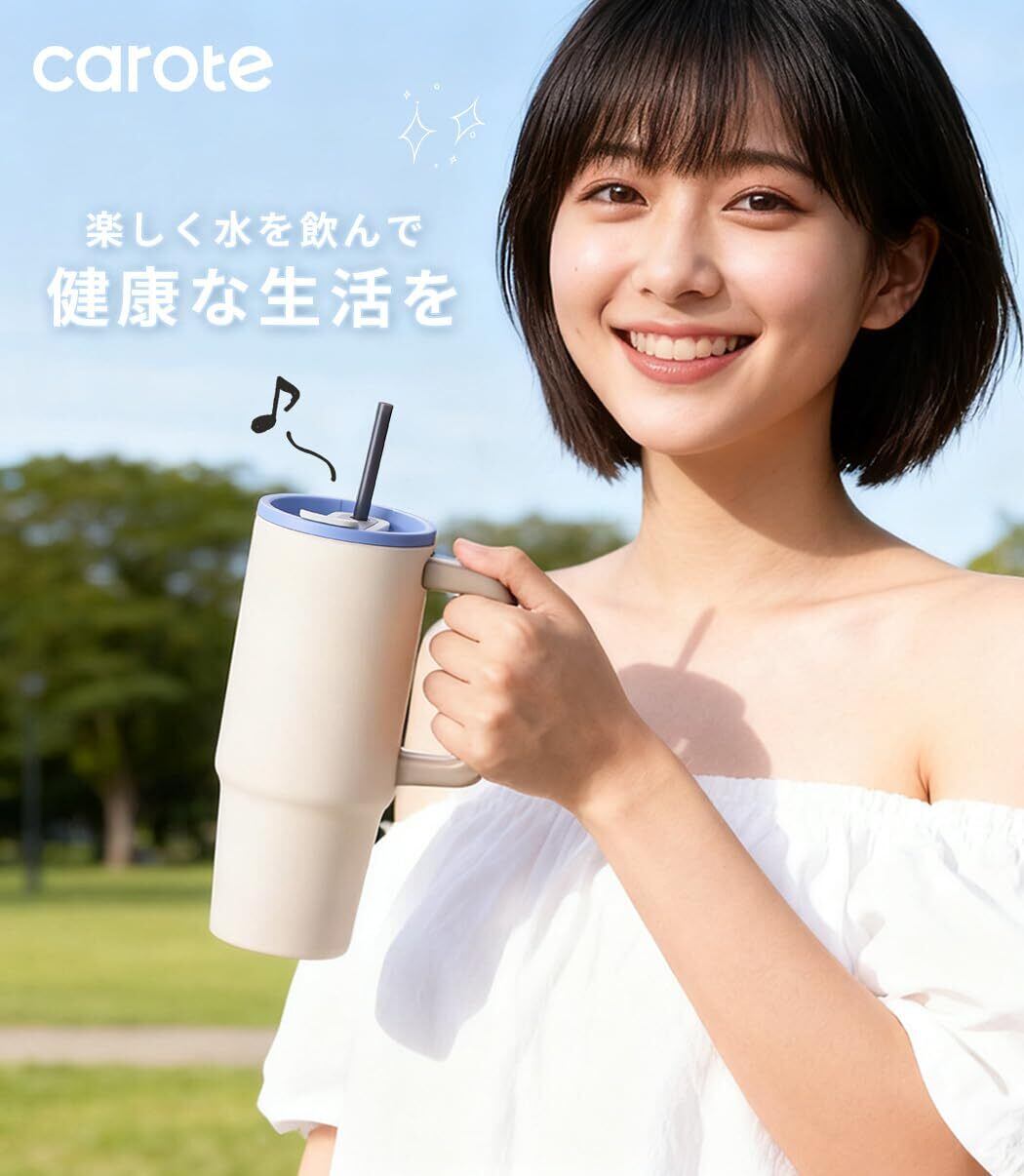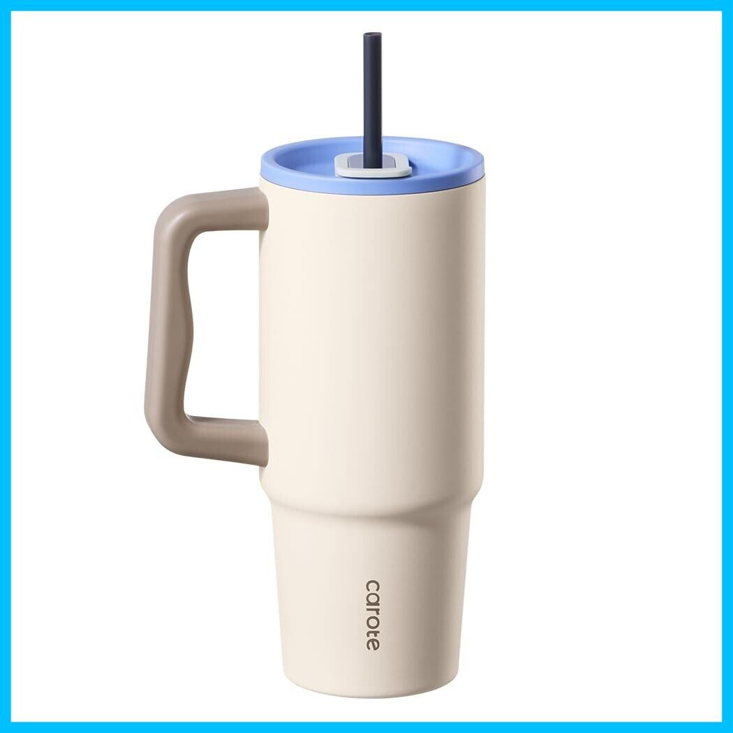 CAROTE カローテ 水筒 1020ml 真空断熱 タンブラー大容量 保温保冷 ステンレスマグボトル (ストロー付き・直飲み可能)ハンドル付き 軽量設計 食洗機対応 大口経で洗いやすい BPAフリー アウトドア キャンプ オフィス ベージュ