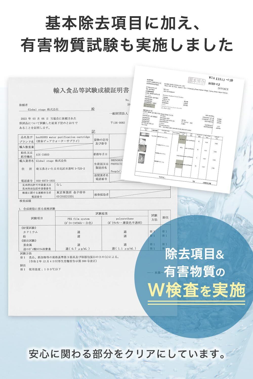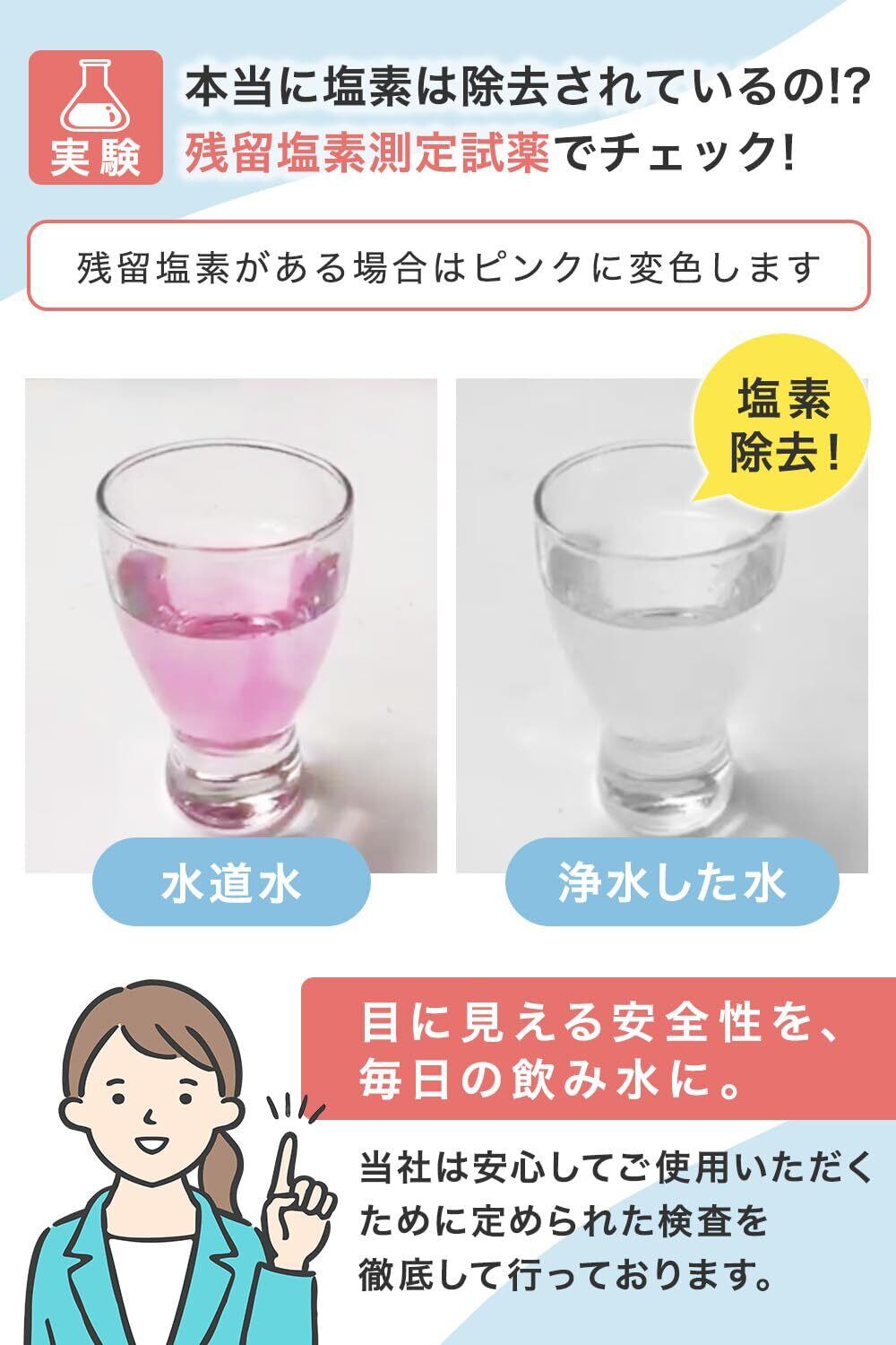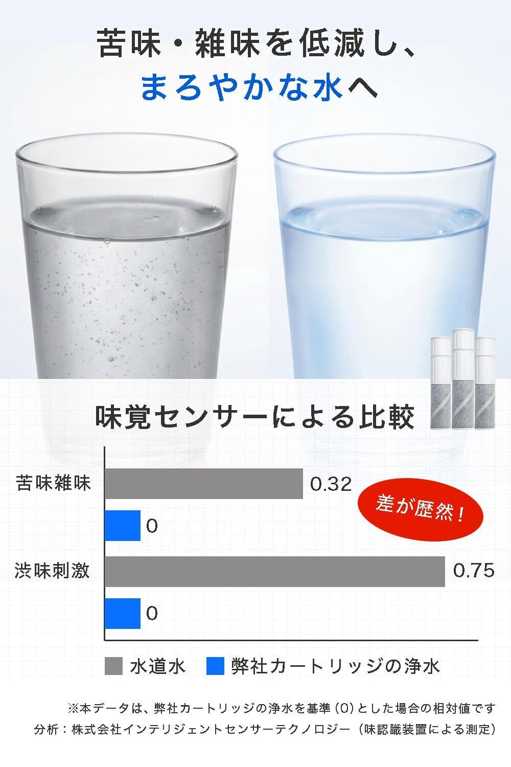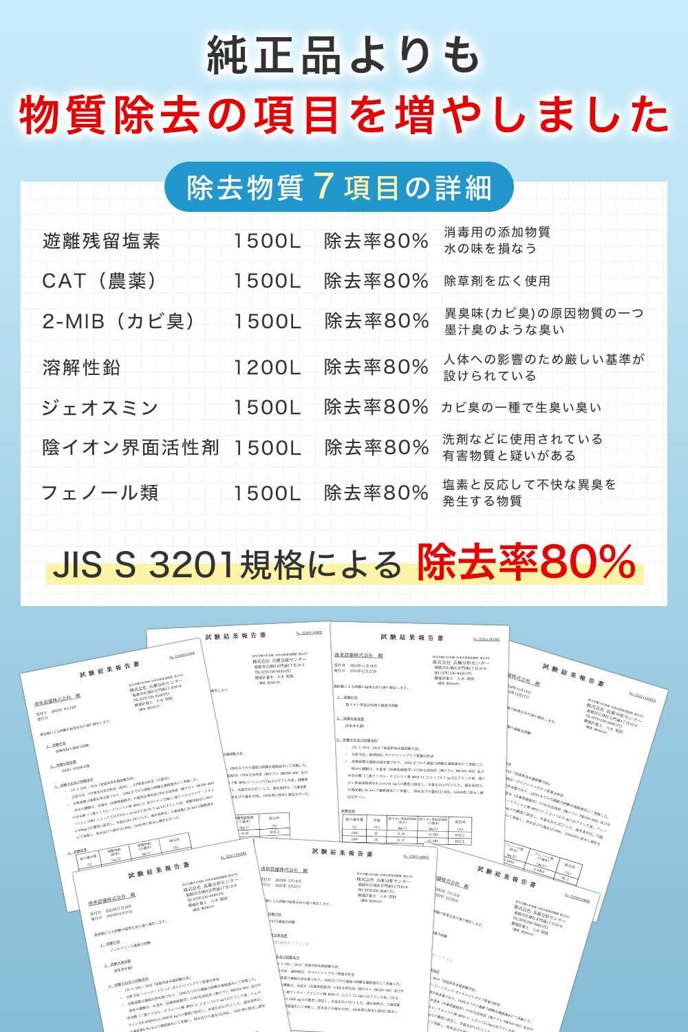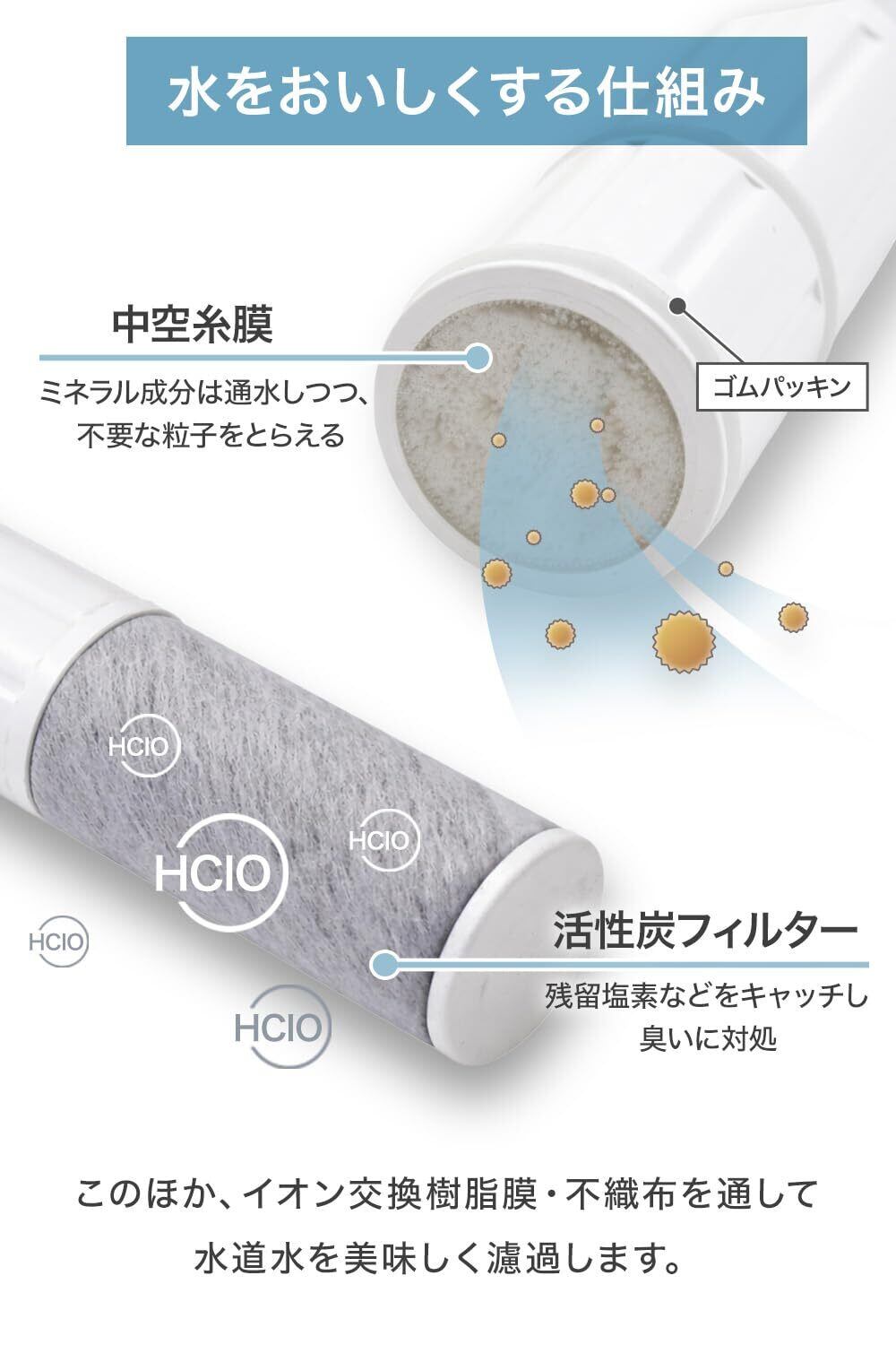 【浄水能力】 7物質除去(遊離残留塩素、CAT、2-MIB[カビ臭]、溶解性鉛、フェノール類、ジェオスミン、陰イオン界面活性剤) ※一部パッケージには除去項目の反映・記載がない場合がありますが、試験にて7項目すべての除去性能を確認済みです。 【ろ材の種類】 中空糸膜、イオン交換繊維、活性炭、不織布 【カートリッジ交換の目安】 1日10L使用の場合:約4ヶ月/1個 3個セットで合計約1年分 ※使用水量・水質・水圧などにより、交換時期は前後する場合があります。