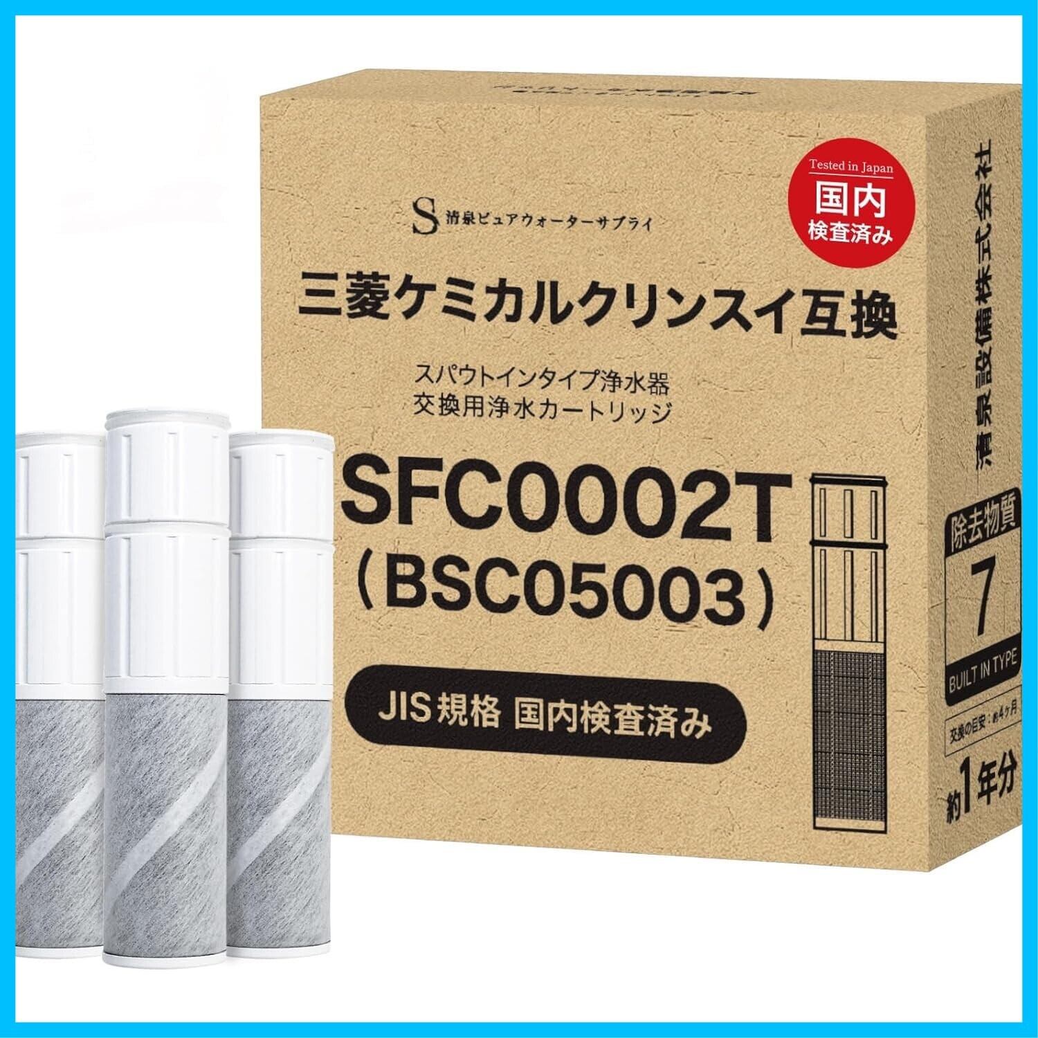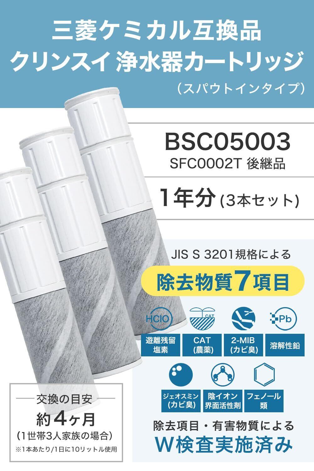 クリンスイ対応 浄水カートリッジ SFC0002T 互換品(BSC05003・SFC0002TTS・ZSRJT002R12BC・FP1025・PZ871-3同等)7項目除去 スパウトインタイプ 水栓一体型浄水器用 3本セット