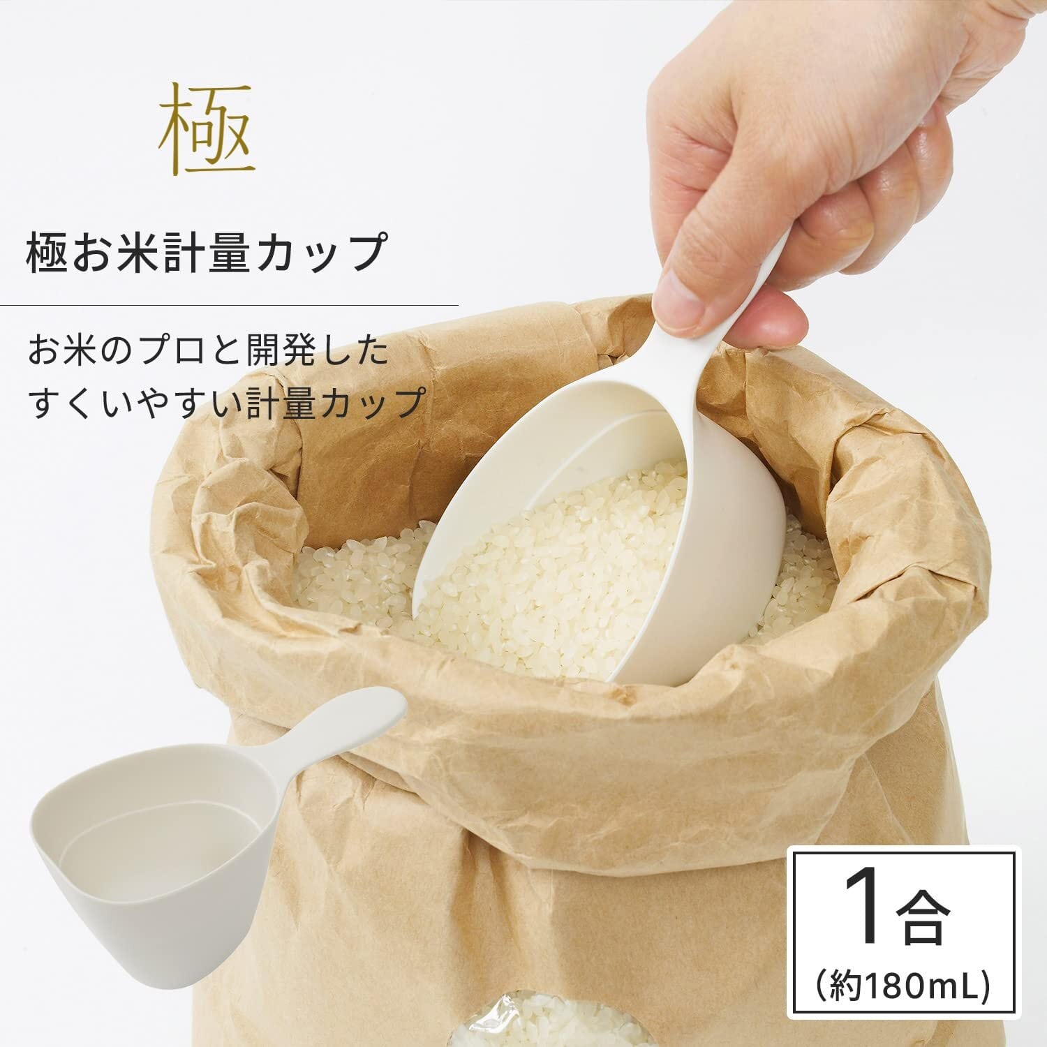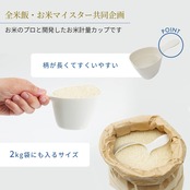 【すくいやすさを極めた計量カップ】お米のプロと開発した、すくいやすい計量カップです。長めの持ち手とフチの薄さにこだわり、すくいやすさを極めました。