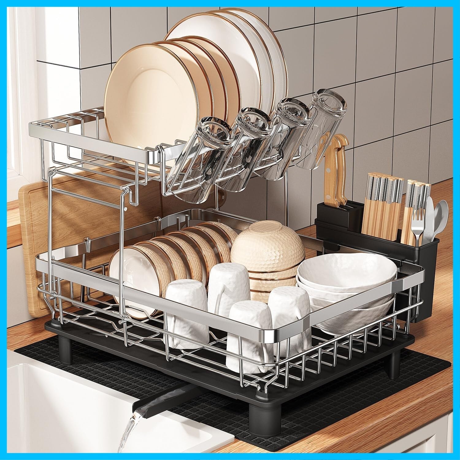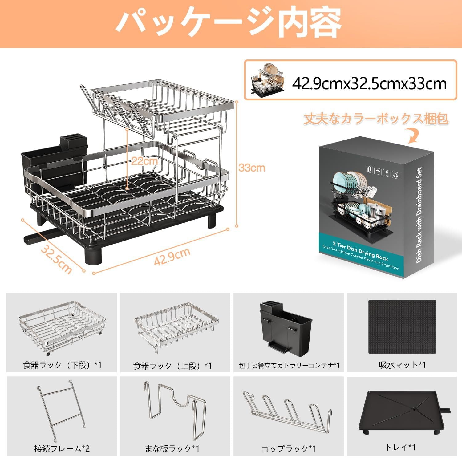 MAJALiS 食器 水切りラック 2段 ステンレス 食器乾燥ラック 洗い物置き 水切りかご 水切りカゴ 洗いかご 皿立て キッチン 台所 304ステンレス製 包丁スタンド 箸立て 大容量 自動排水 組立簡単 2段式長さ42.9*幅32.5*高さ33CM