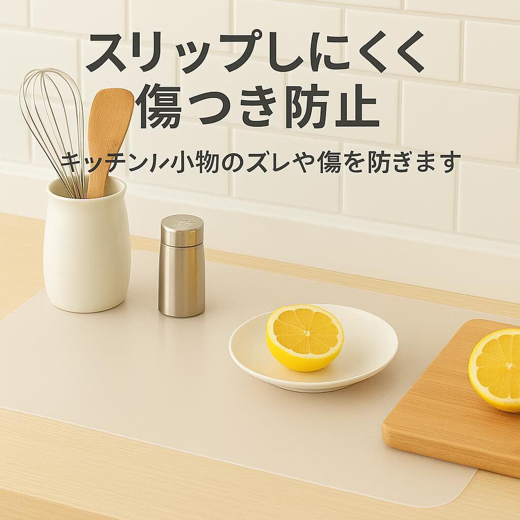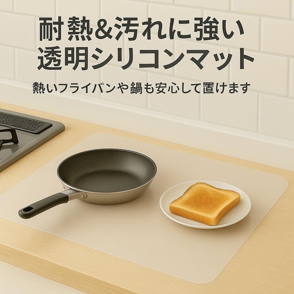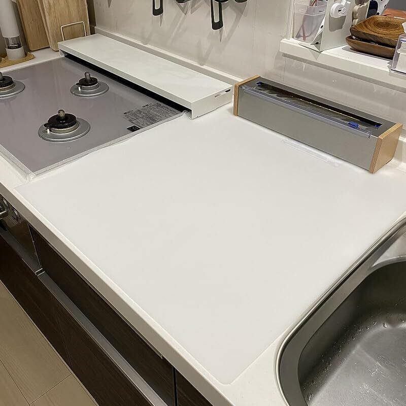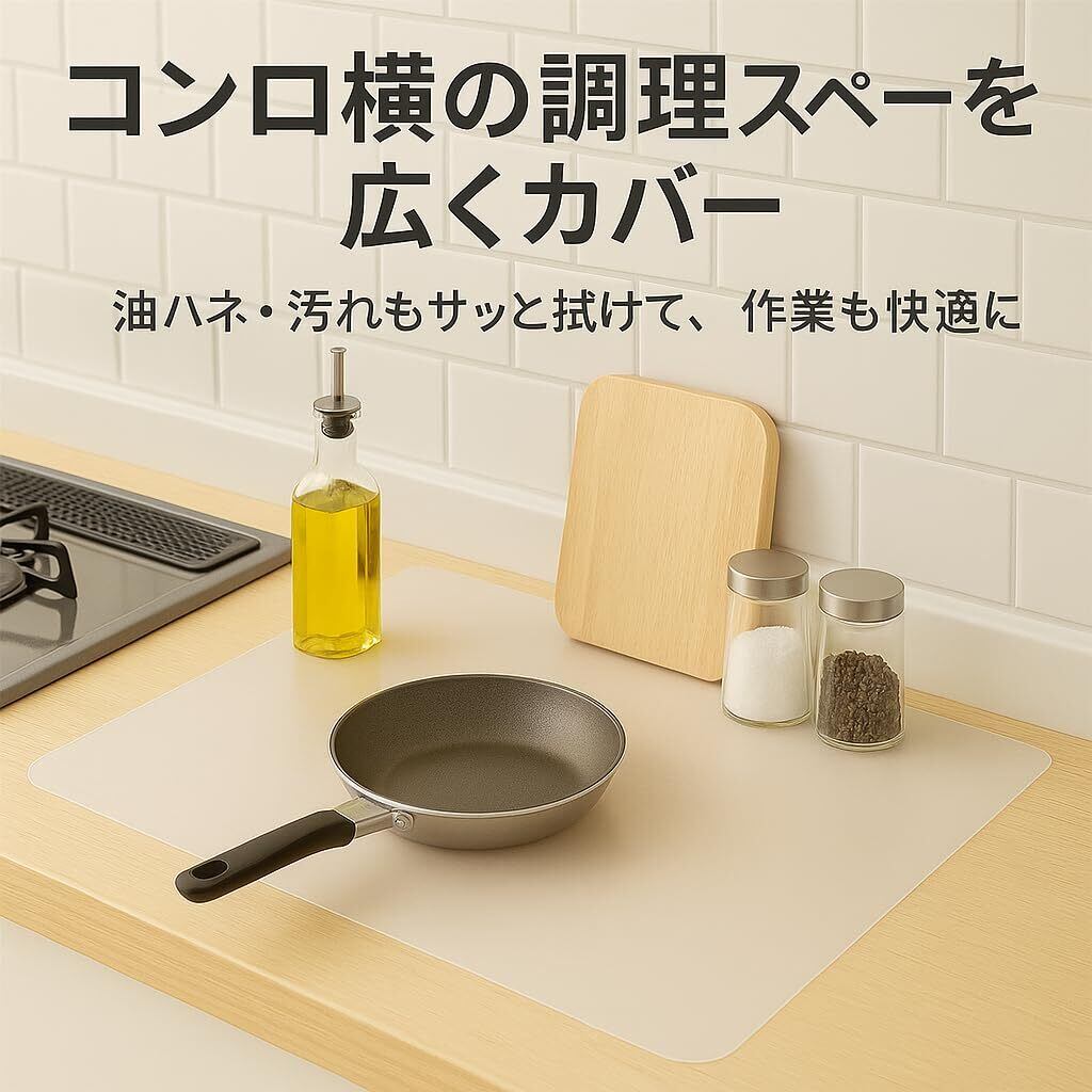 【置くだけ設置・シリコンマット】 粘着剤不要の置くだけタイプ。シリコンマットが調理台保護と掃除のしやすさを両立。鏡面天板では空気層が見える場合があるため、敷く前に水拭き→中央から外側へ押し出し→乾いたら端部を整えると目立ちにくくなります。
