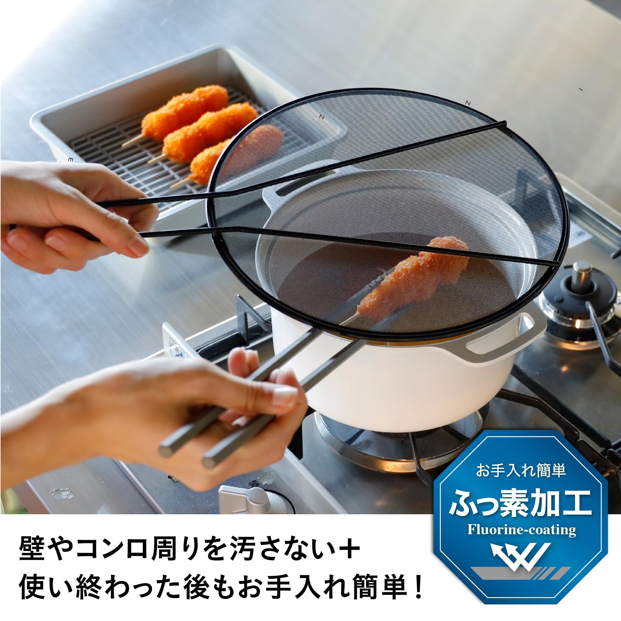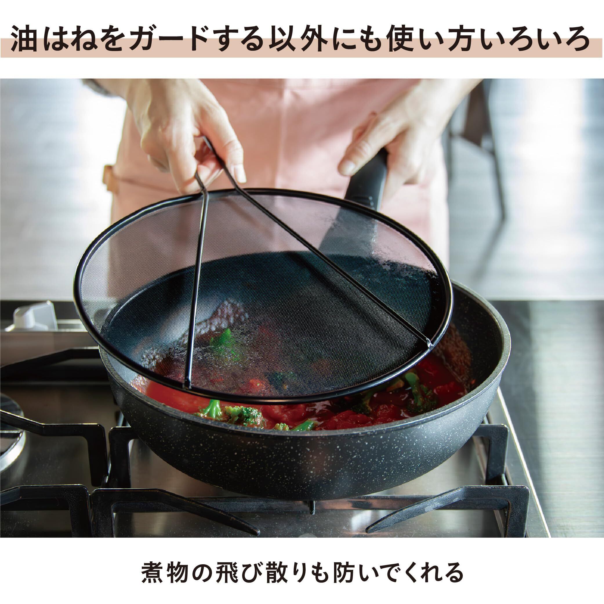 ネットは、ふっ素加工を施した黒メッシュなので反射しにくく、調理中も食材の様子を確認しやすいのもポイントです。揚げ物だけでなく、調理中の煮物の飛び散りも防いでくれます。