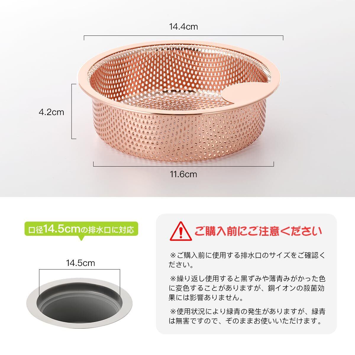 【ご注意】繰り返し使用すると黒ずみや薄青みがかった色に変色することがありますが、銅イオンの殺菌効果には影響ありません。使用状況により緑青の発生がありますが、緑青は無害ですので、ぞのままお使いいただけます。