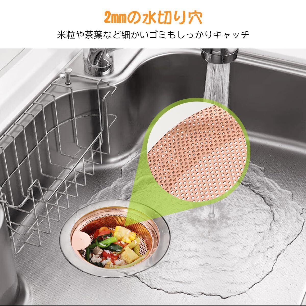 【ゴミ受け】口径14.5cmの排水口に対応。排水口 ゴミ受けは2mmの水切り穴で、米粒や茶葉など細かいゴミもしっかりキャッチします。