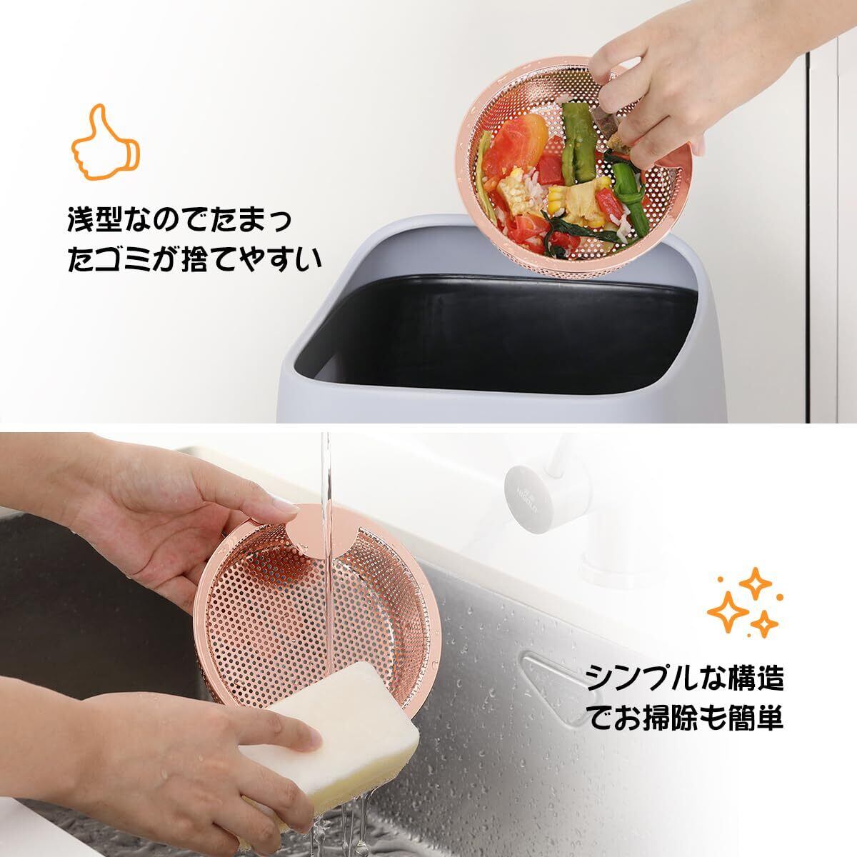 【浅型】排水口水切りカゴは浅型なのでたまったゴミが捨てやすいく、シンプルな構造でお掃除も簡単です。