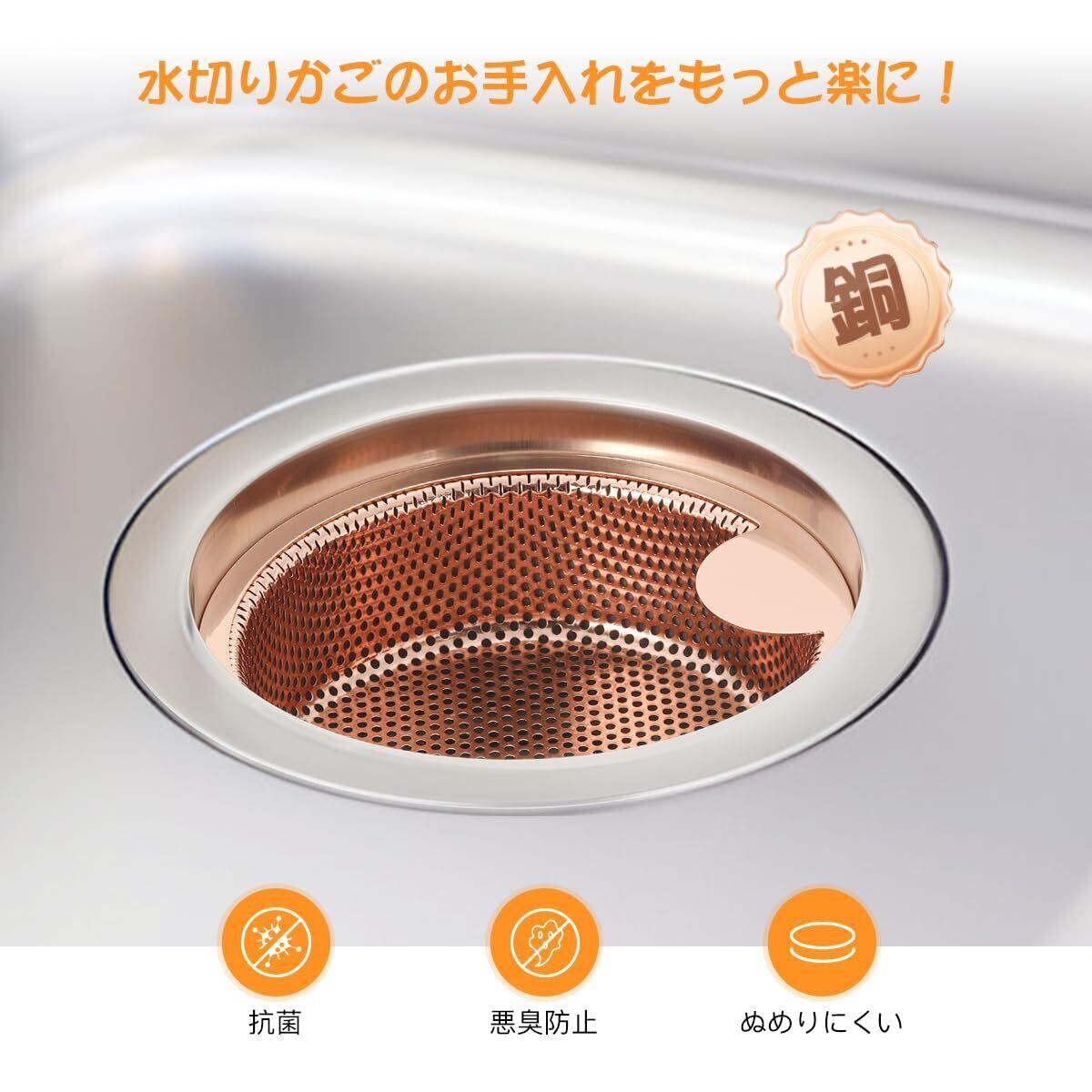 【抗菌 防臭】銅イオンには抗菌作用があり、悪臭を防ぎぬめりにくい、水切りかごのお手入れの手間を軽減します。※時間の経過とともに、銅特有の黒ずみ色へ変化しますが、銅イオンの効果には影響ありません。