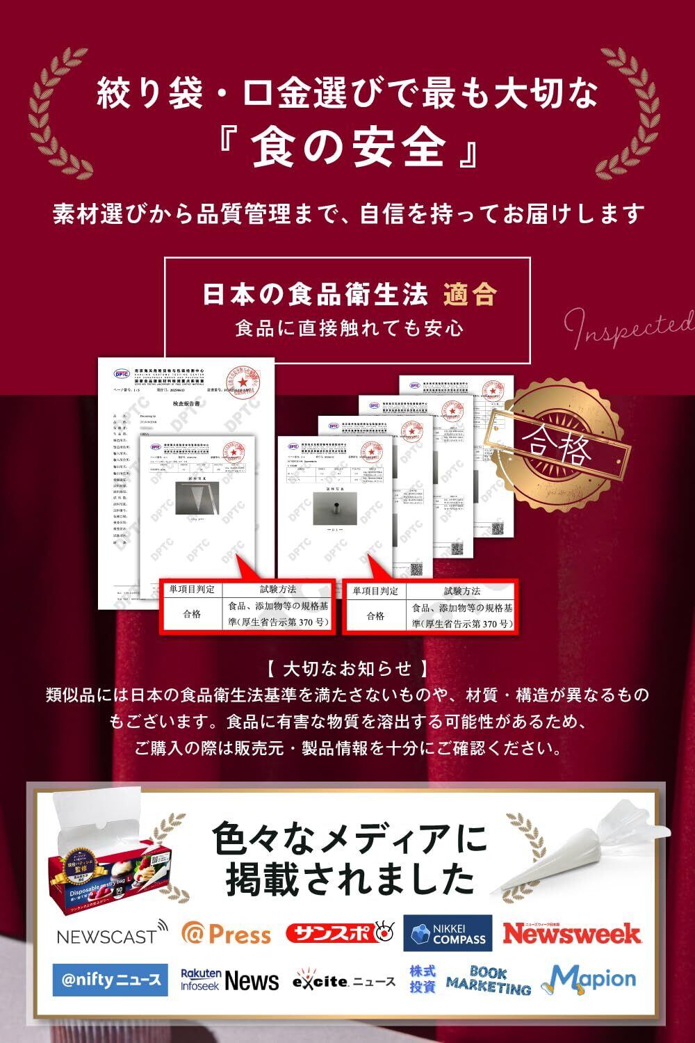 【 食品衛生法適合 】厚生労働省認定の第三者機関で検査した結果、見事食品衛生法をクリア。安心してお菓子作りを楽しめます。