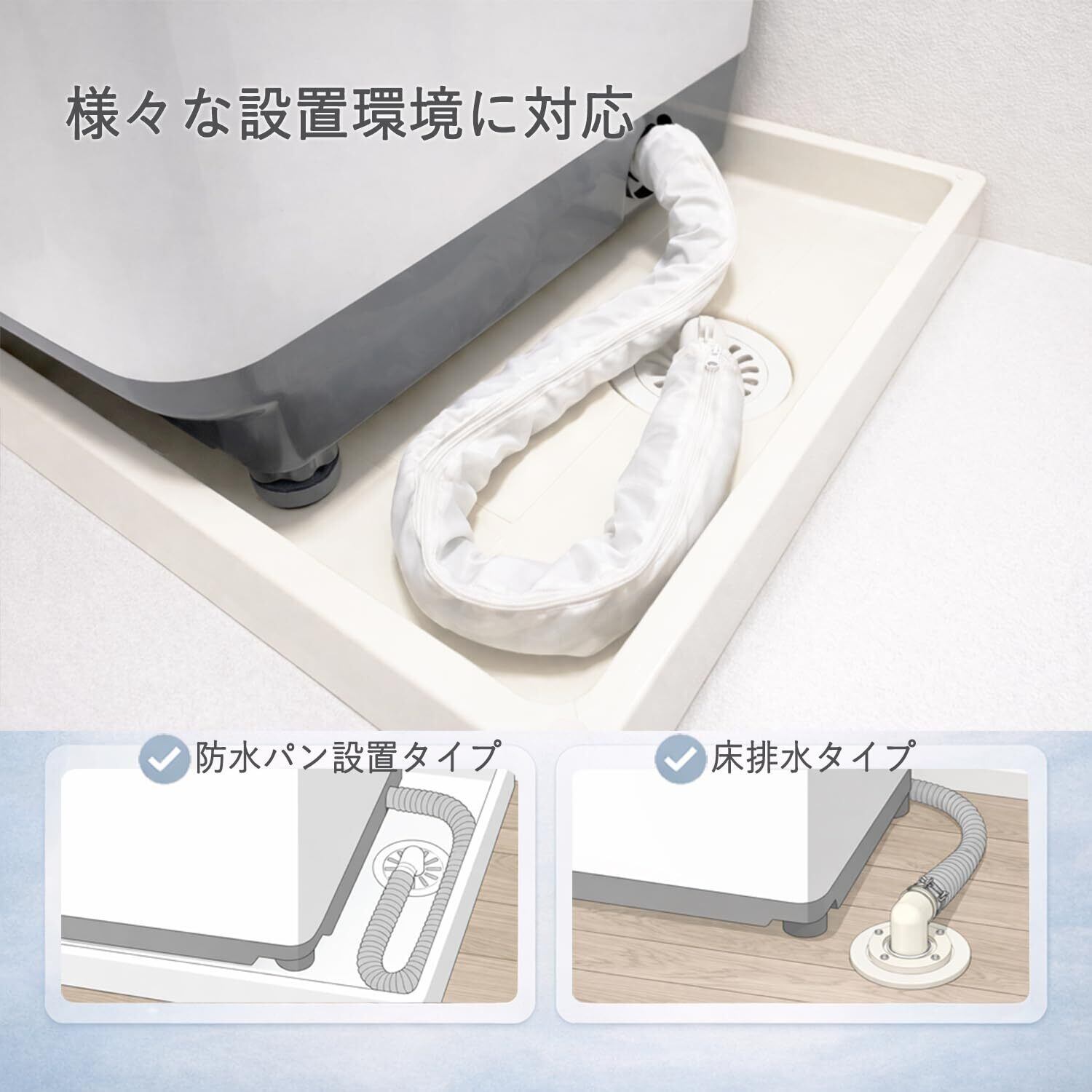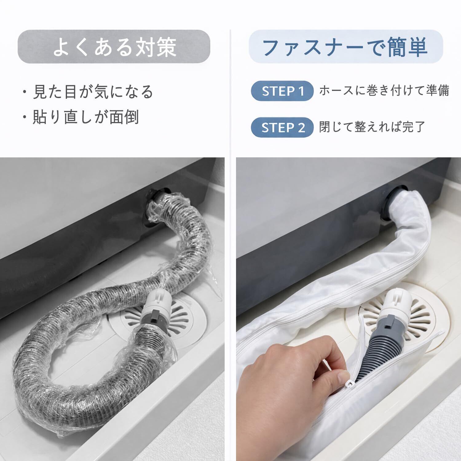 取り付け簡単:ファスナー式で、排水ホースに後付け可能。取り付け・取り外しがスムーズで、掃除や位置調整の際も手間がかかりません。