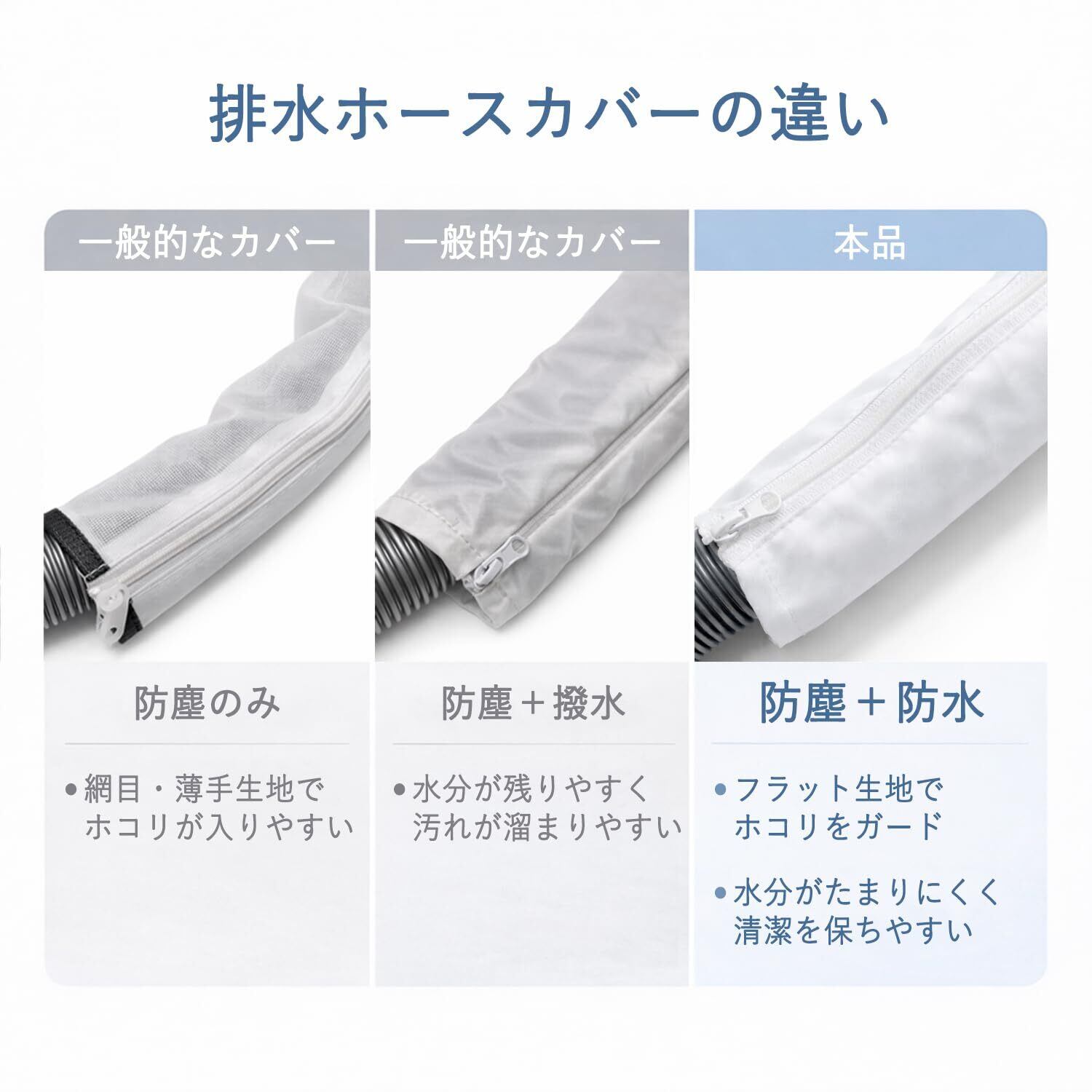 汚れにくい理由:水に強い防水加工素材を使用。水や湿気がしみこみにくく、排水ホースが濡れた状態になりにくいため、汚れが付着しにくい設計です。