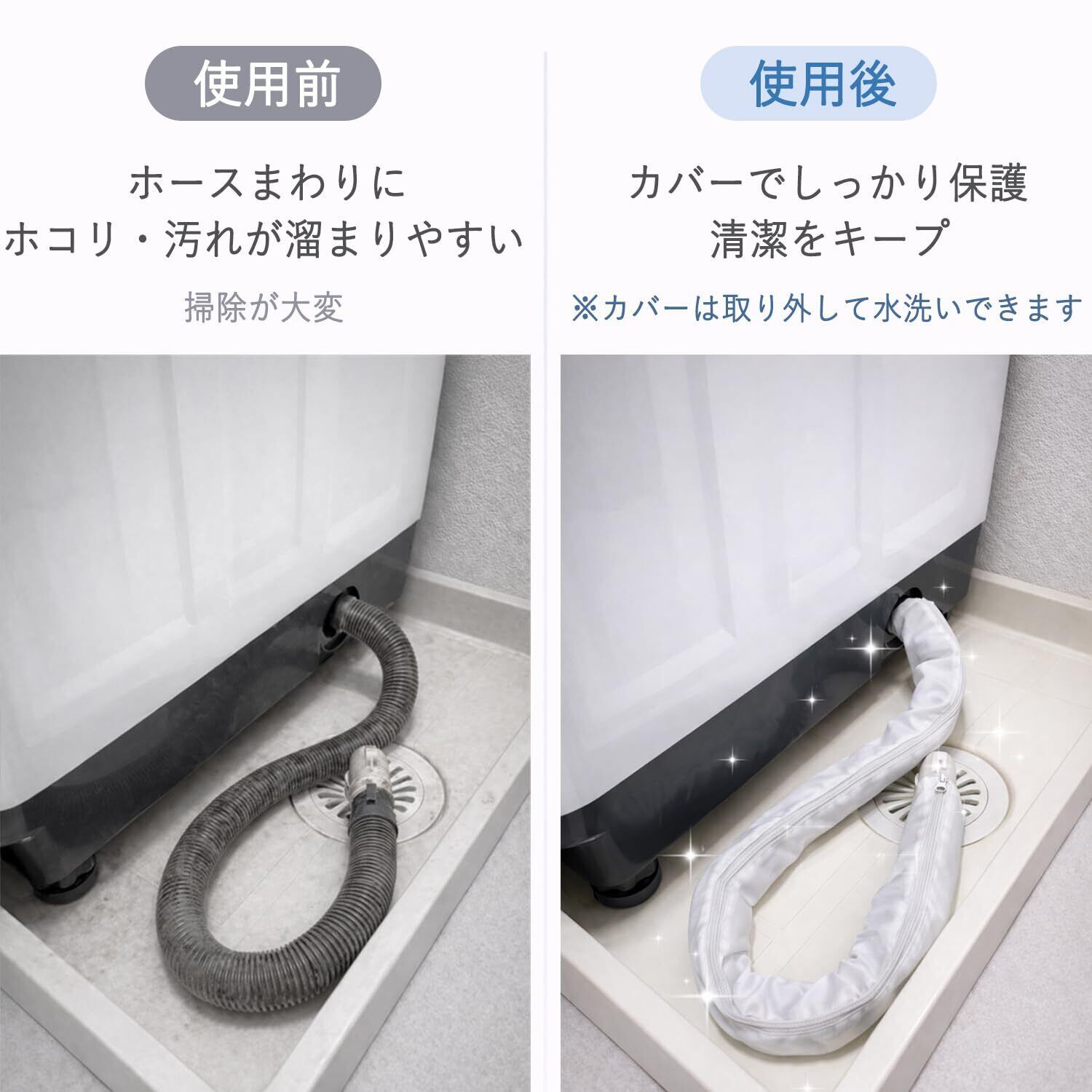 ホコリ・汚れ防止:洗濯機の排水ホースにたまりやすいホコリや汚れをカバーで防止。普段掃除しにくい排水ホースまわりを覆うことで、見た目をすっきり保ち、日々のお手入れが楽になります。