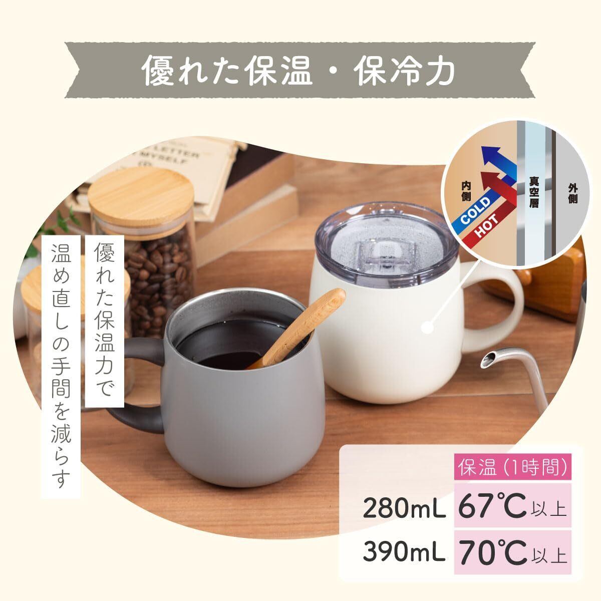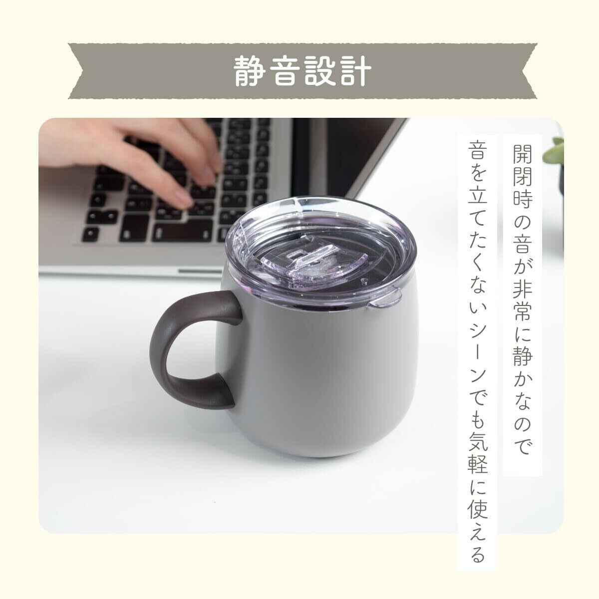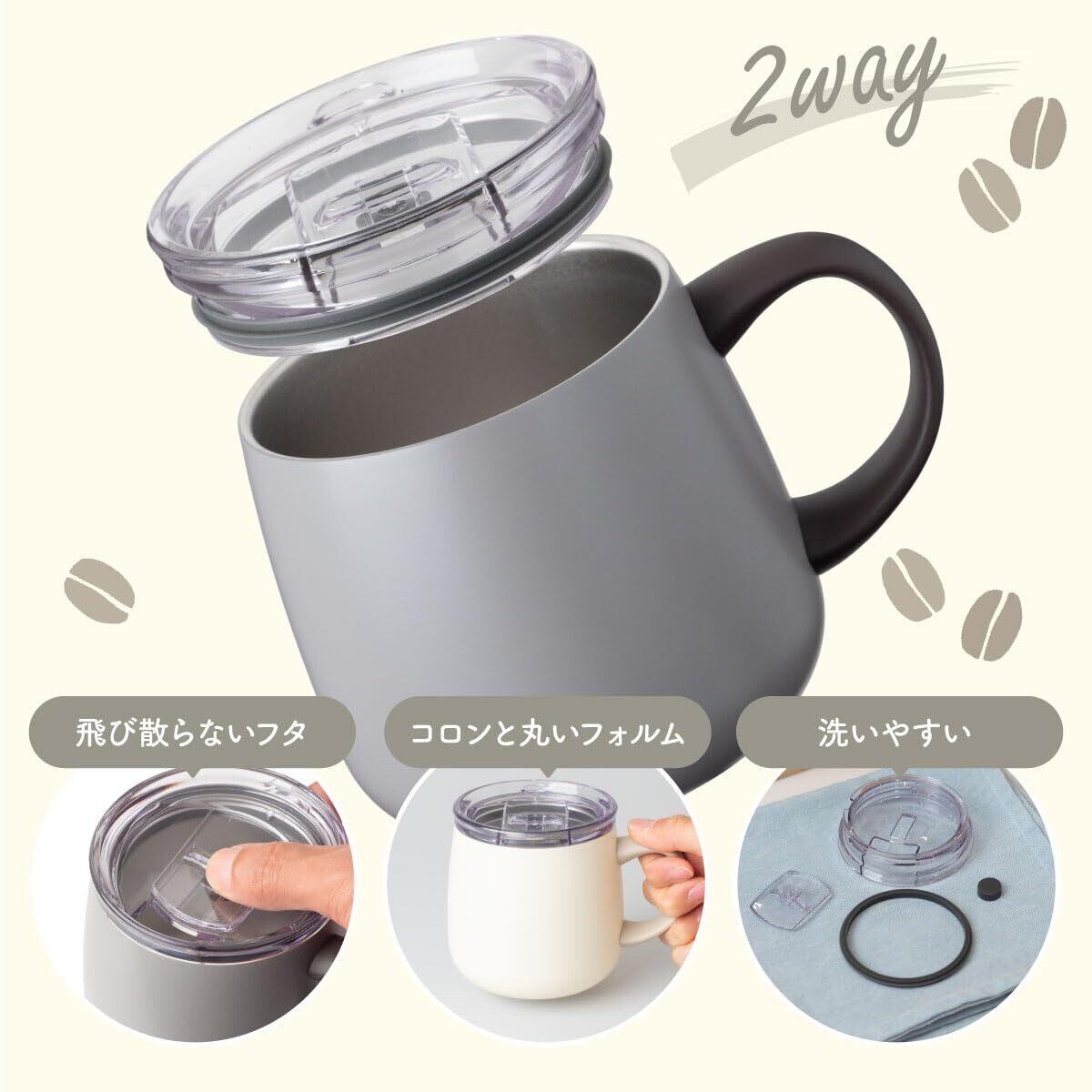 水滴が飛び散りにくい『グリップスライド機構』のふた付き! 書類やそでを汚さないカフェタンブラー 直接ドリップ可能(サイズによって一部使用できないものがあります)。 真空断熱構造で保温保冷効果が長持ち。 ふた付きで保温効果UP。 長時間美味しい温度でコーヒーを楽しめます。 氷がラクラク入る広口の口径。 パッキンは簡単に取り外し可能。 細部まで洗えて清潔を保てます。 保温・保冷両用。