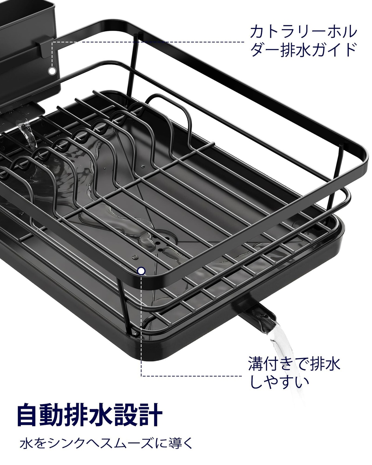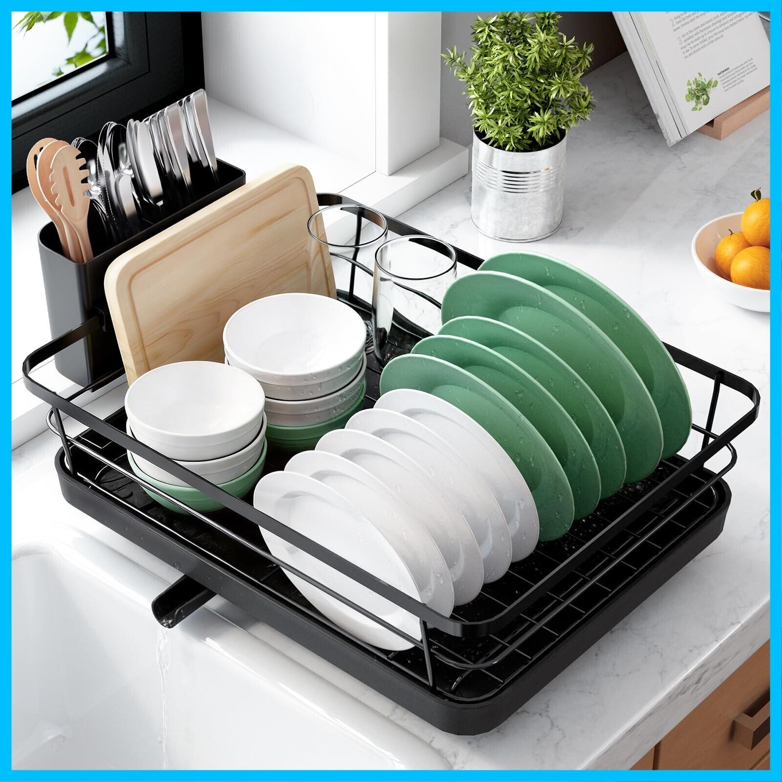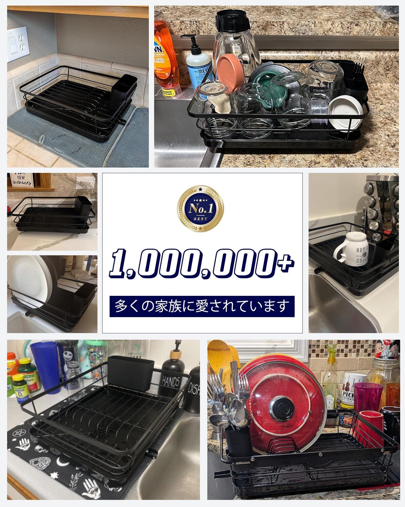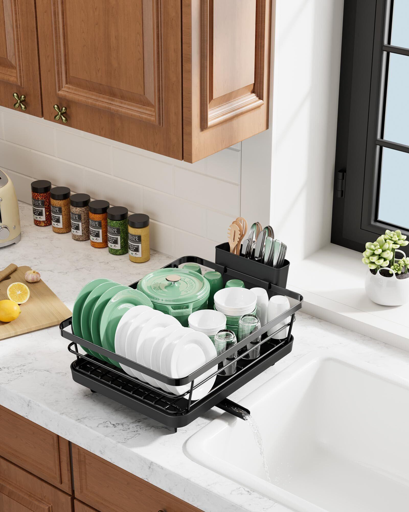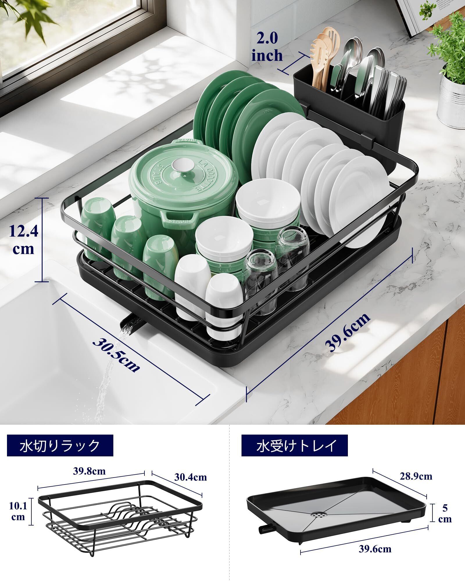 Kitsure 食器水切りラック - スペース節約型の水切りかご カトラリーボックス付き食器乾燥ラック 奥行き30.5cm×幅39.6cm ブラック