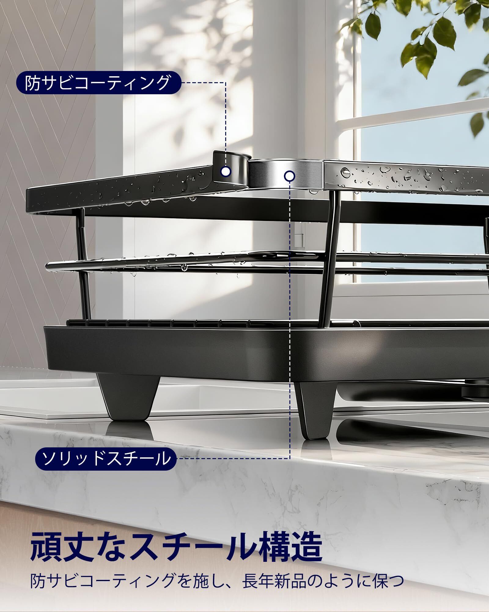 高品質な素材:Kitsure キッチン洗い物ラックは、プラスチック製の水受けトレーとプレミアムステンレス製のラックを採用。これにより、錆びや変形を効果的に防止します。さらに、使用後は流水でサッと洗うだけで簡単にお手入れ可能。安心して食器類を収納できます。