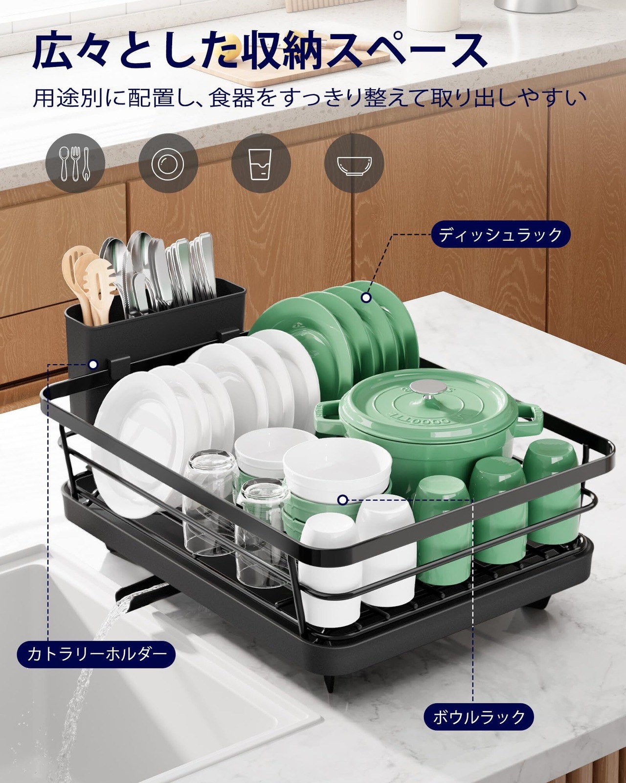 取り外し可能なカトラリーホルダー:カトラリーホルダーは2つの仕切り付きで、カトラリーや小物を分けて収納可能。スプーンやフォーク、箸などのさまざまな食器を整理整頓できるので、使いやすさ抜群です!