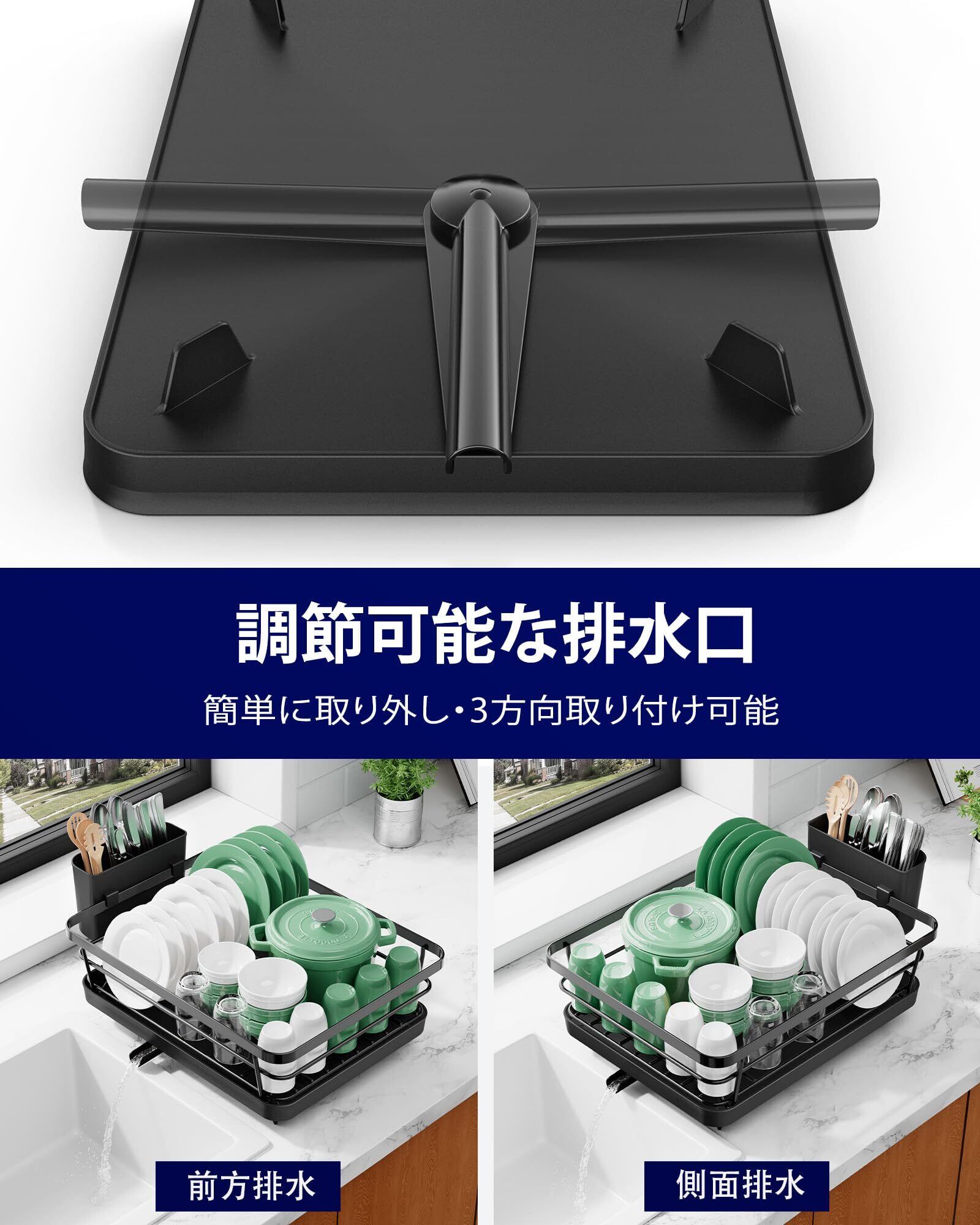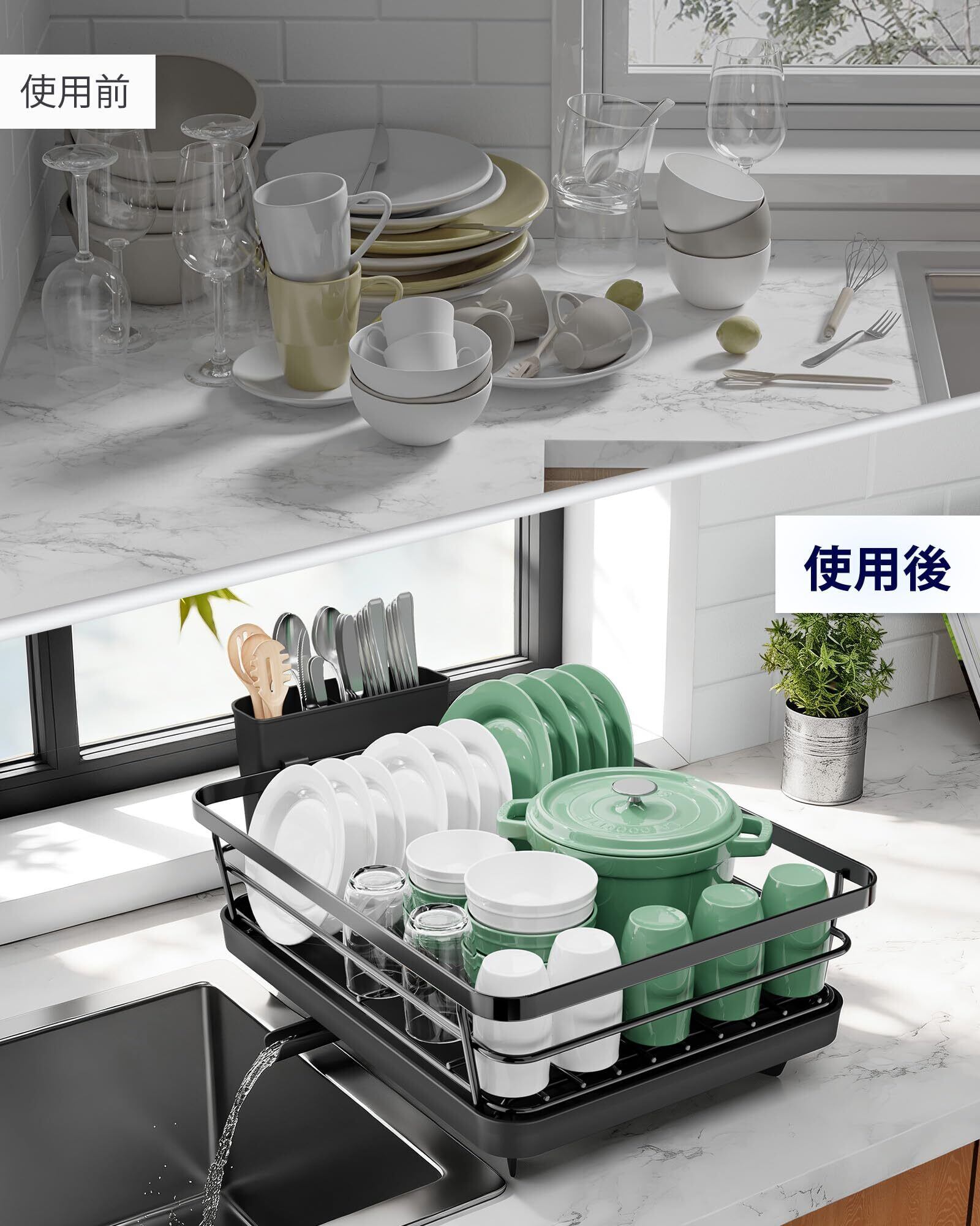 便利な排水機能:この食器置きには排水口が備わっており、水がスムーズにシンクへ流れる設計になっています。カウンターに水が溜まる心配がなく、清潔で快適なキッチン環境を維持できます。