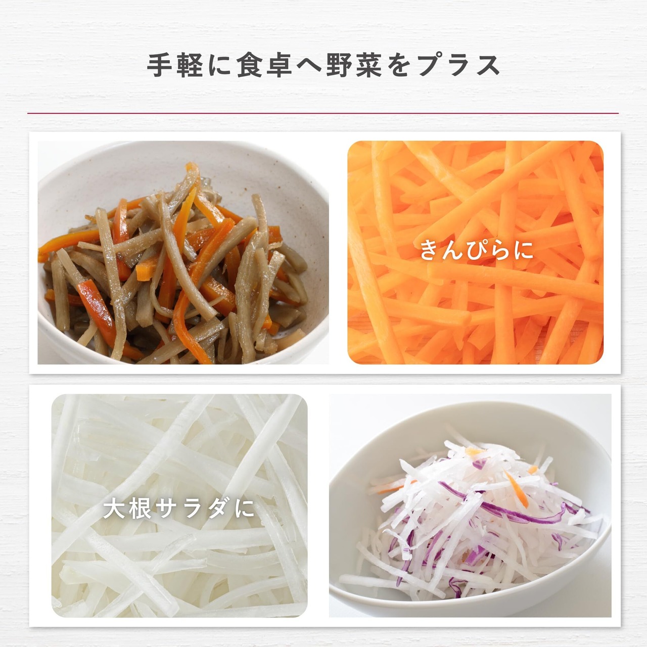 「押す」と「引く」両動作で調理できるのでスピーディーに千切り出来ます。