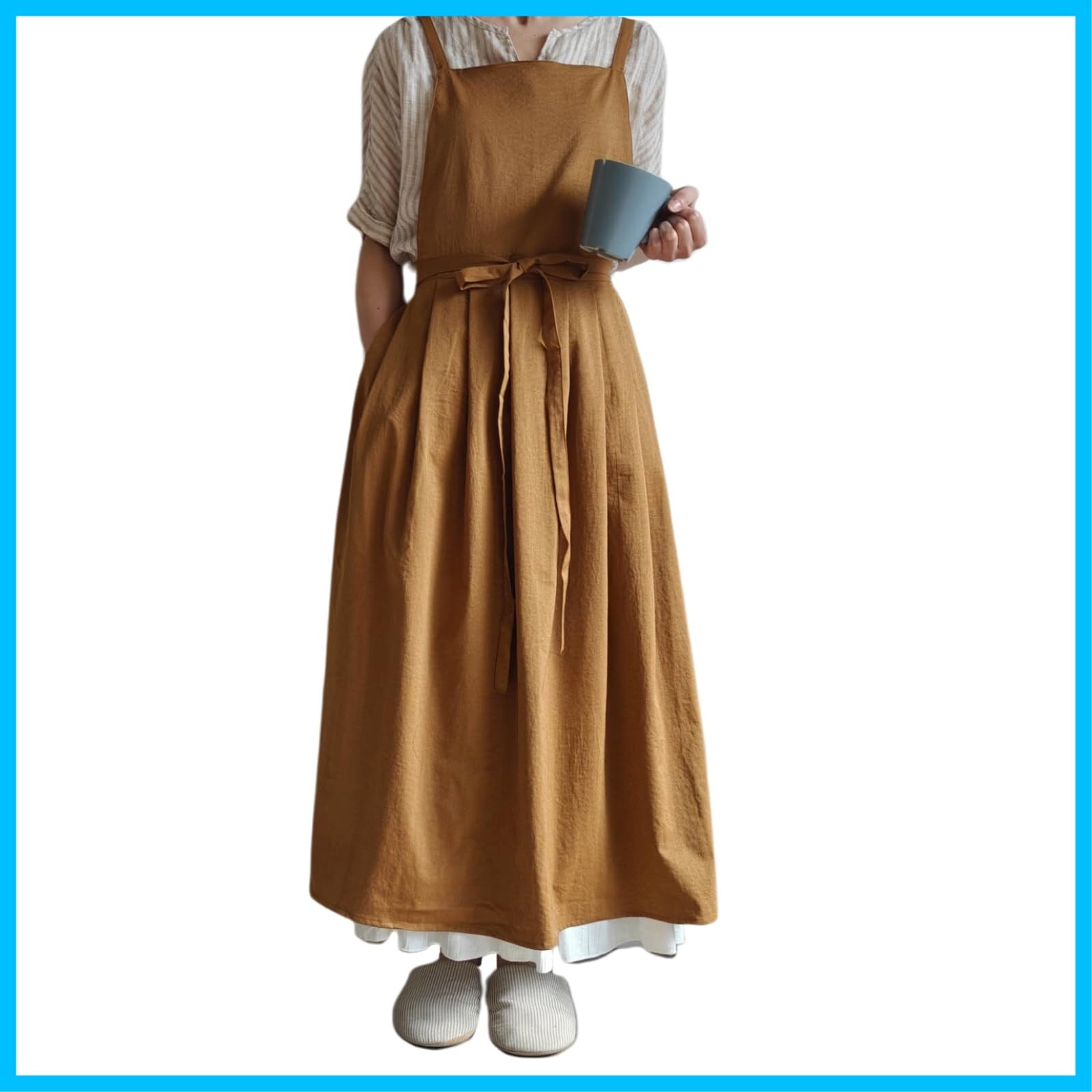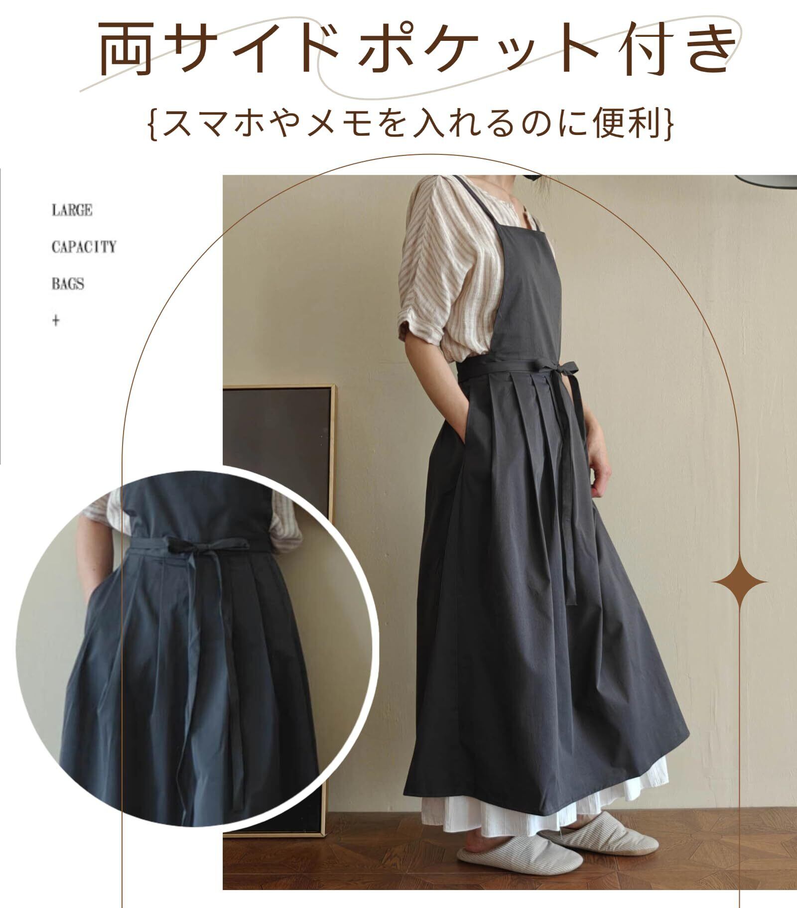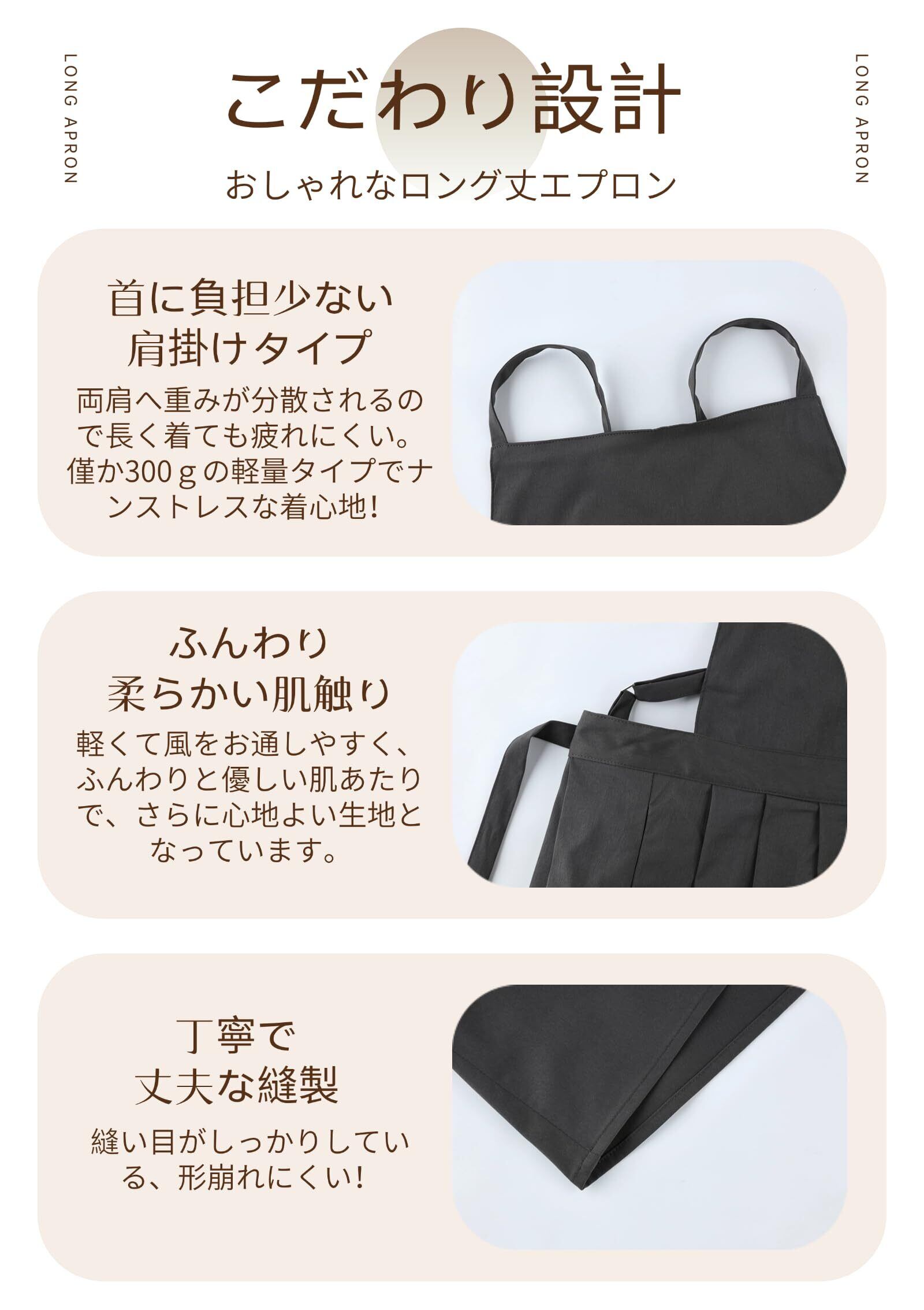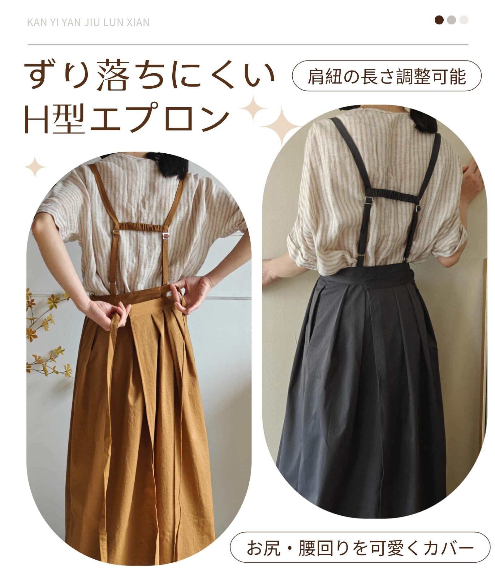 【お尻が隠れるエプロン、女性のお悩みをスッキリ解消!】ロングスカートはお尻を覆うようにデザインされており、可愛いドレスのように、ご在宅時でも外出時でも着用でき、体の前後をいつでも美しく見せてくれます。お尻隠し・H型タイプなので後ろ姿もスッキリとした見た目です。ロングスカートのスタイルで、もっと美しいです。