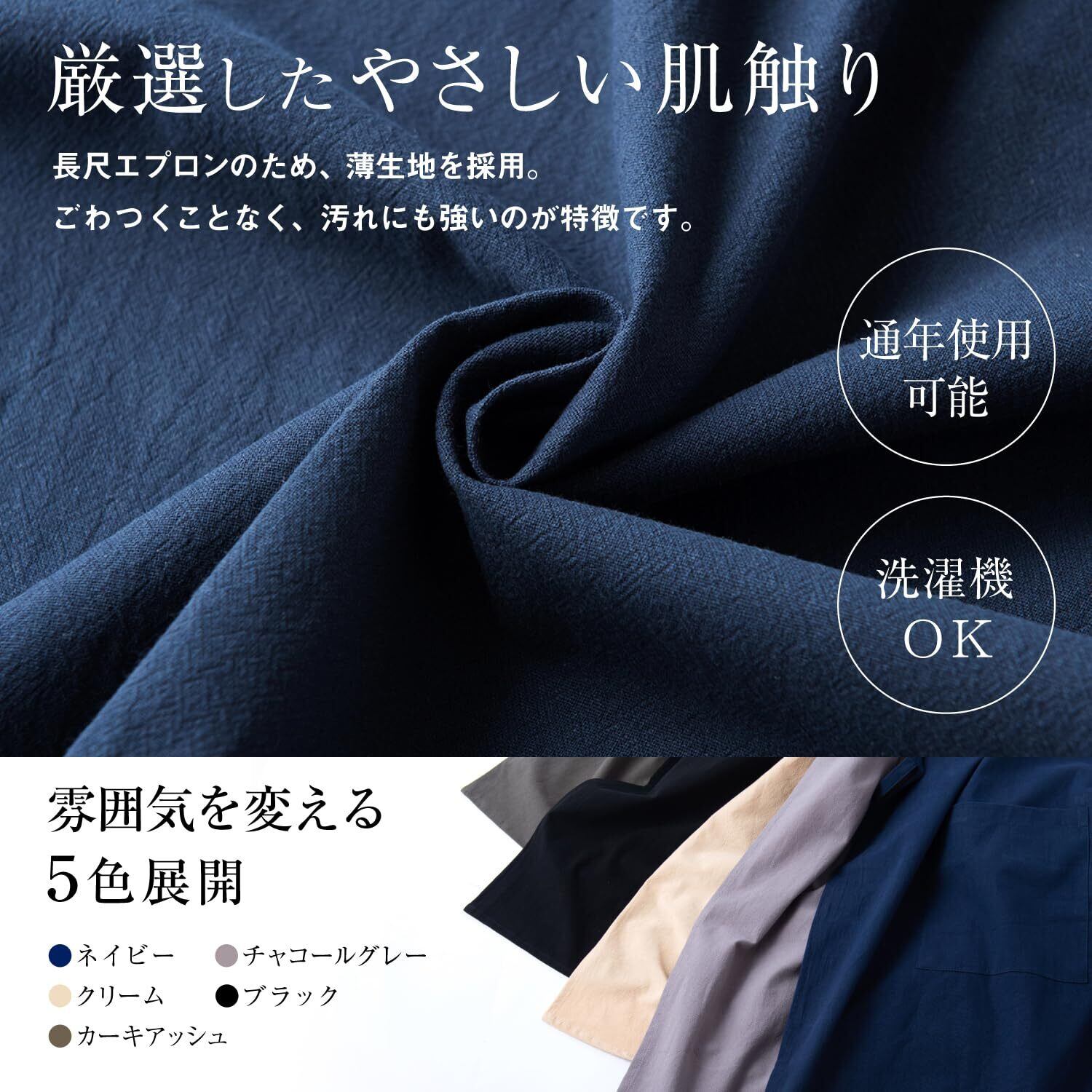 【全面軽撥水加工で長持ち】 エプロンの汚れの原因の多くは水分を含むものが多いため、全面軽撥水加工を施すことで 飛び散る汚れがつきにくく、より長く清潔感ある状態でご使用いただけます。 ※防水ではないので、手を拭いたり、汚れをふきとったりすることは可能です。また洗濯を繰り返すことで徐々に撥水効果はうすれてきます。ご了承ください。