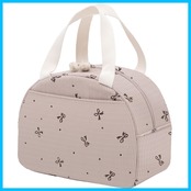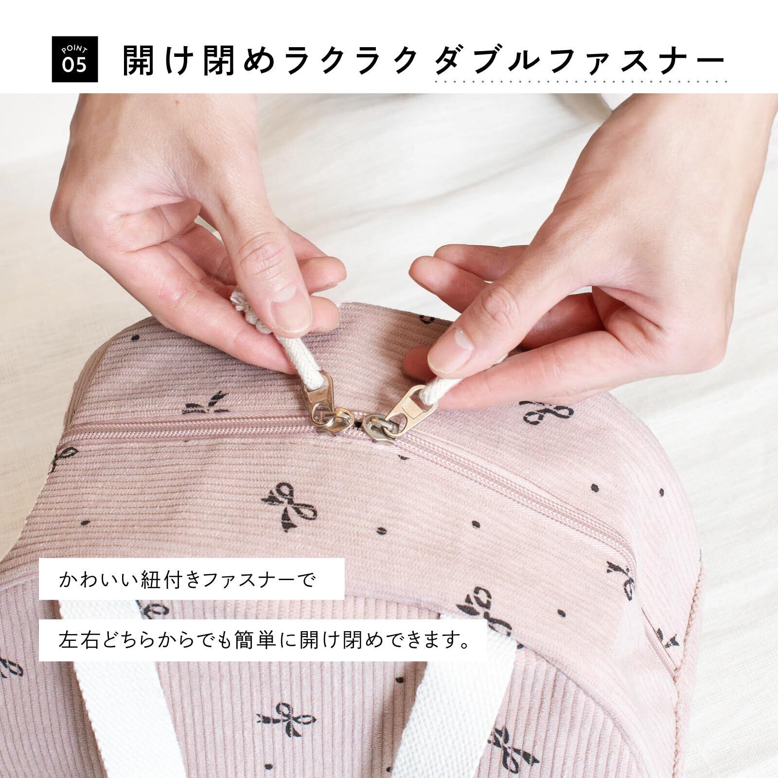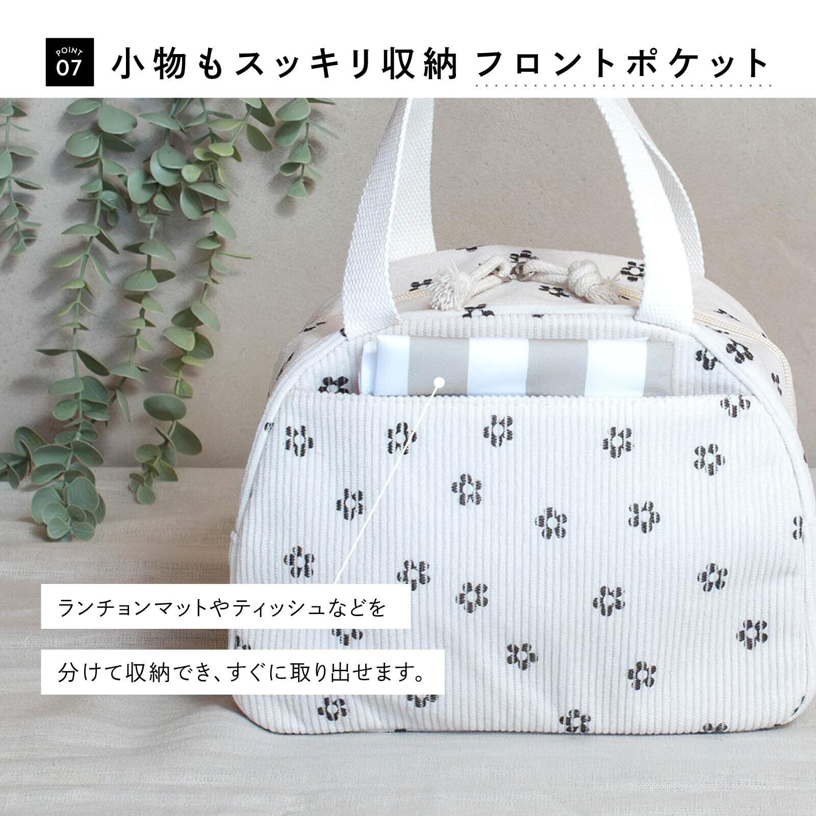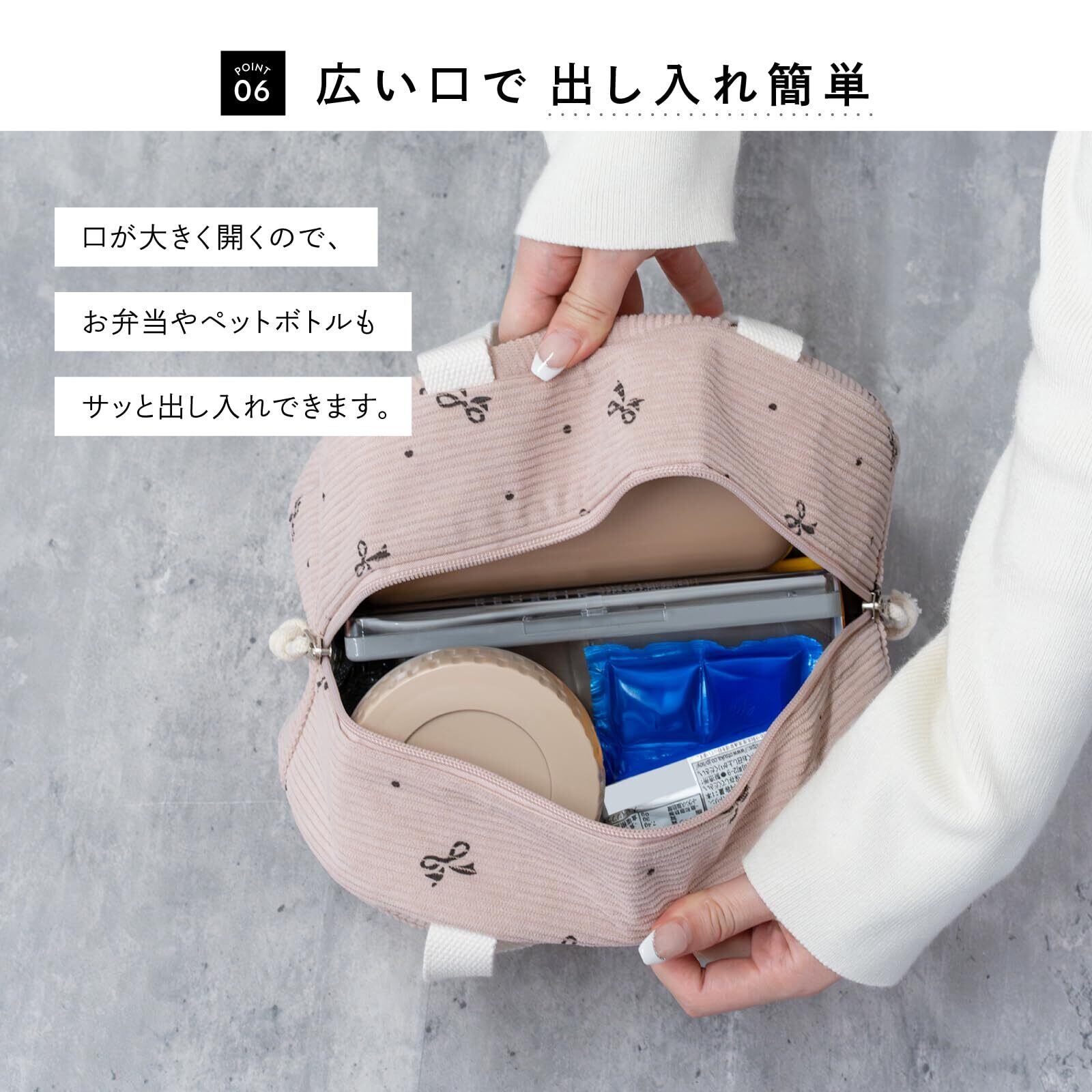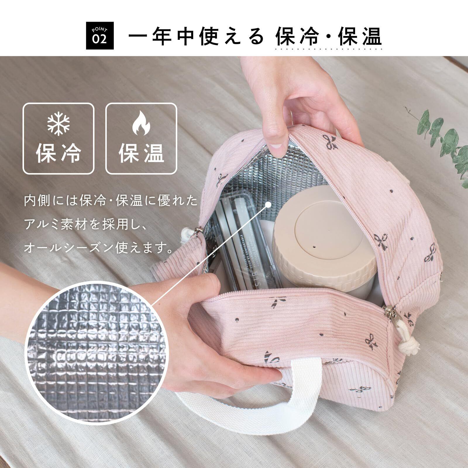 【広い開口部で出し入れ簡単】ダブルファスナー仕様で大きく開くから、お弁当やペットボトルの出し入れもスムーズ。【保冷・保温機能つき】内側にはアルミ素材を使用し、夏はひんやり・冬はあたたかく。オールシーズン快適に使えます。【便利なフロントポケット】フロントポケットはランチマットはもちろん、大型のスマートフォンもすっきり収まるサイズです。ティッシュやカトラリーなどの小物を整理できるので、バッグの中がごちゃつかず便利に使えます。【軽量&持ち運びやすい】約136gと軽量なので、毎日のお弁当持ち歩きがラクラク。