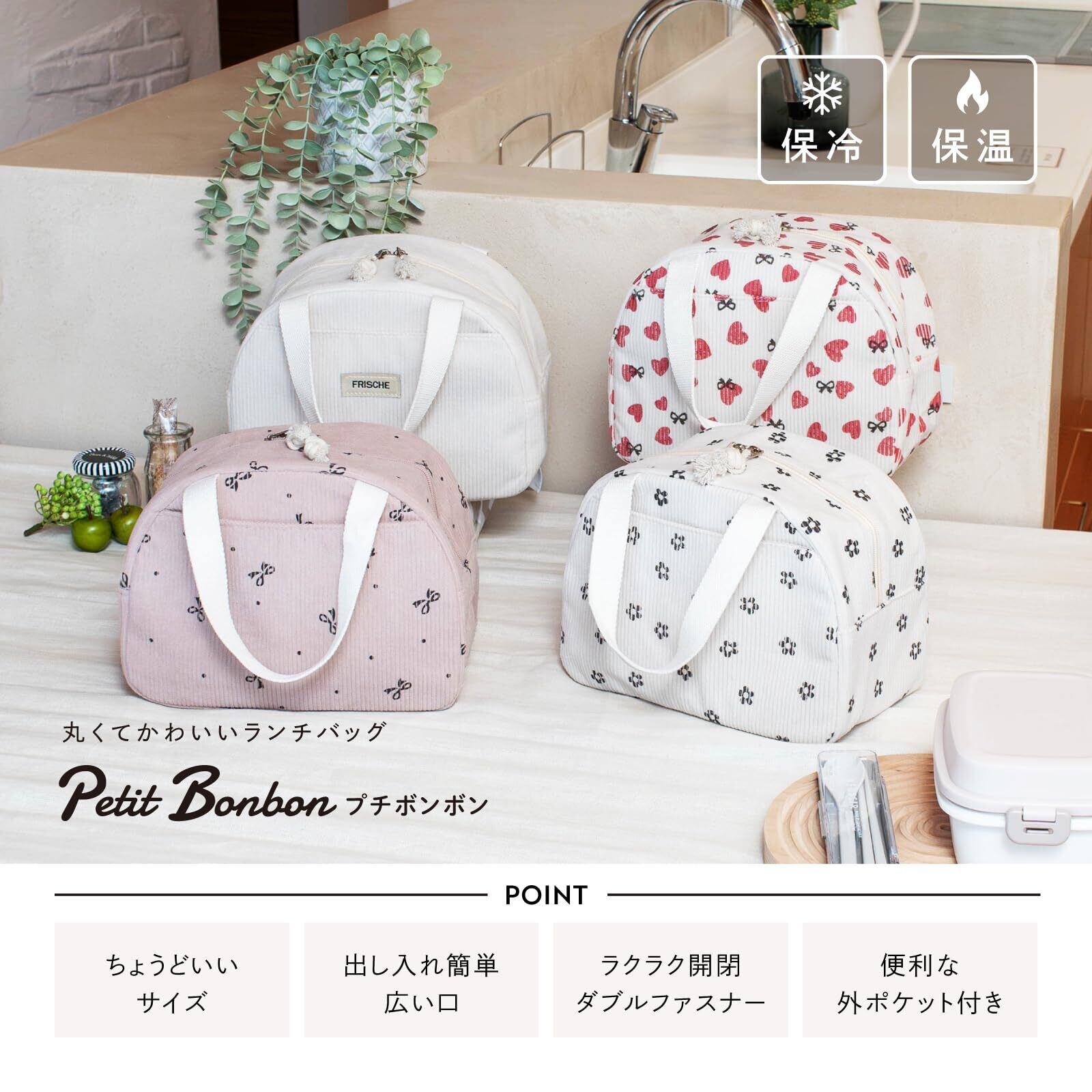 ベルモンド 保冷バッグ ランチバッグ おしゃれ 小さめ 軽量 保冷保温 チャック付き 手提げ お弁当袋 通学 | プチボンボン | B1571 | ピンクリボン