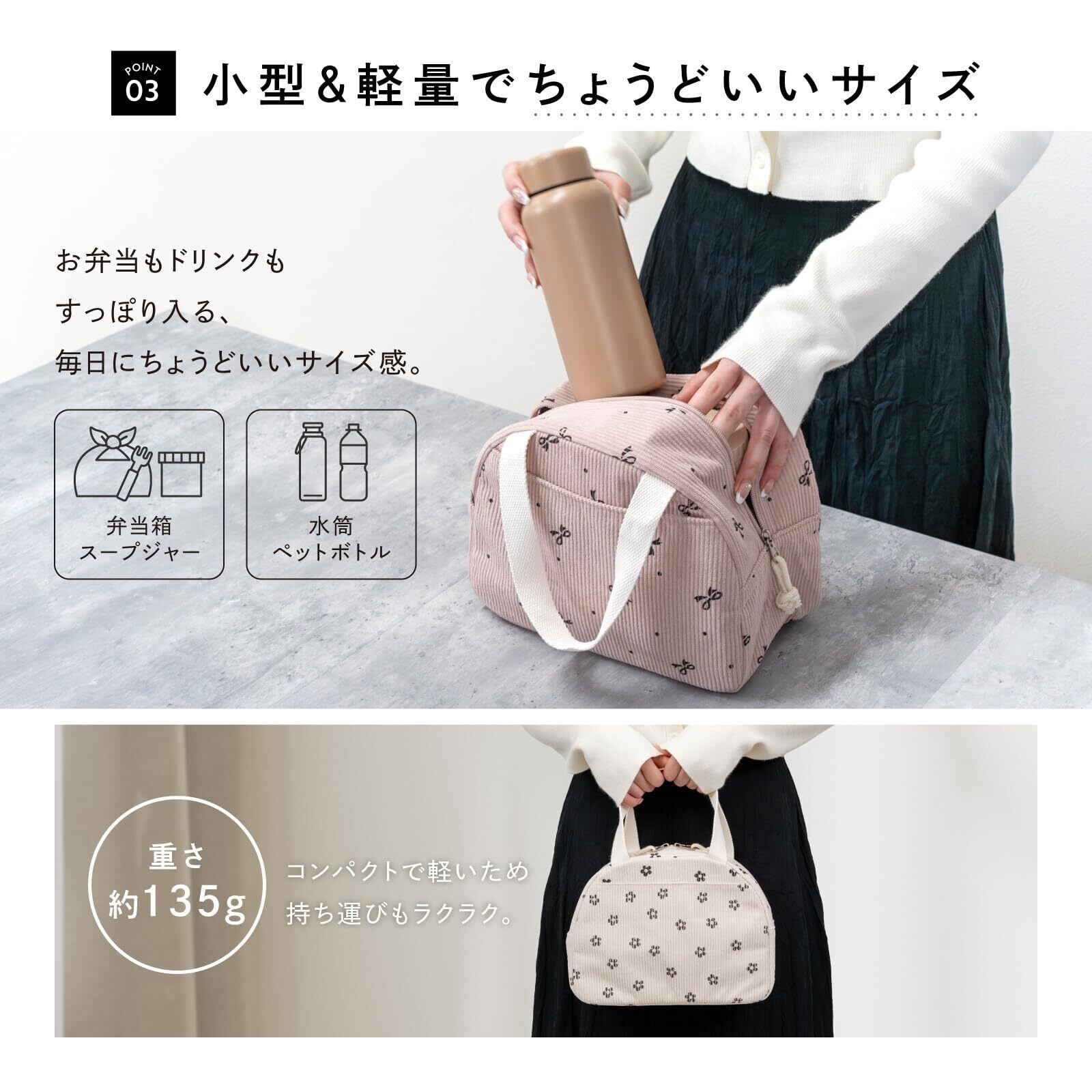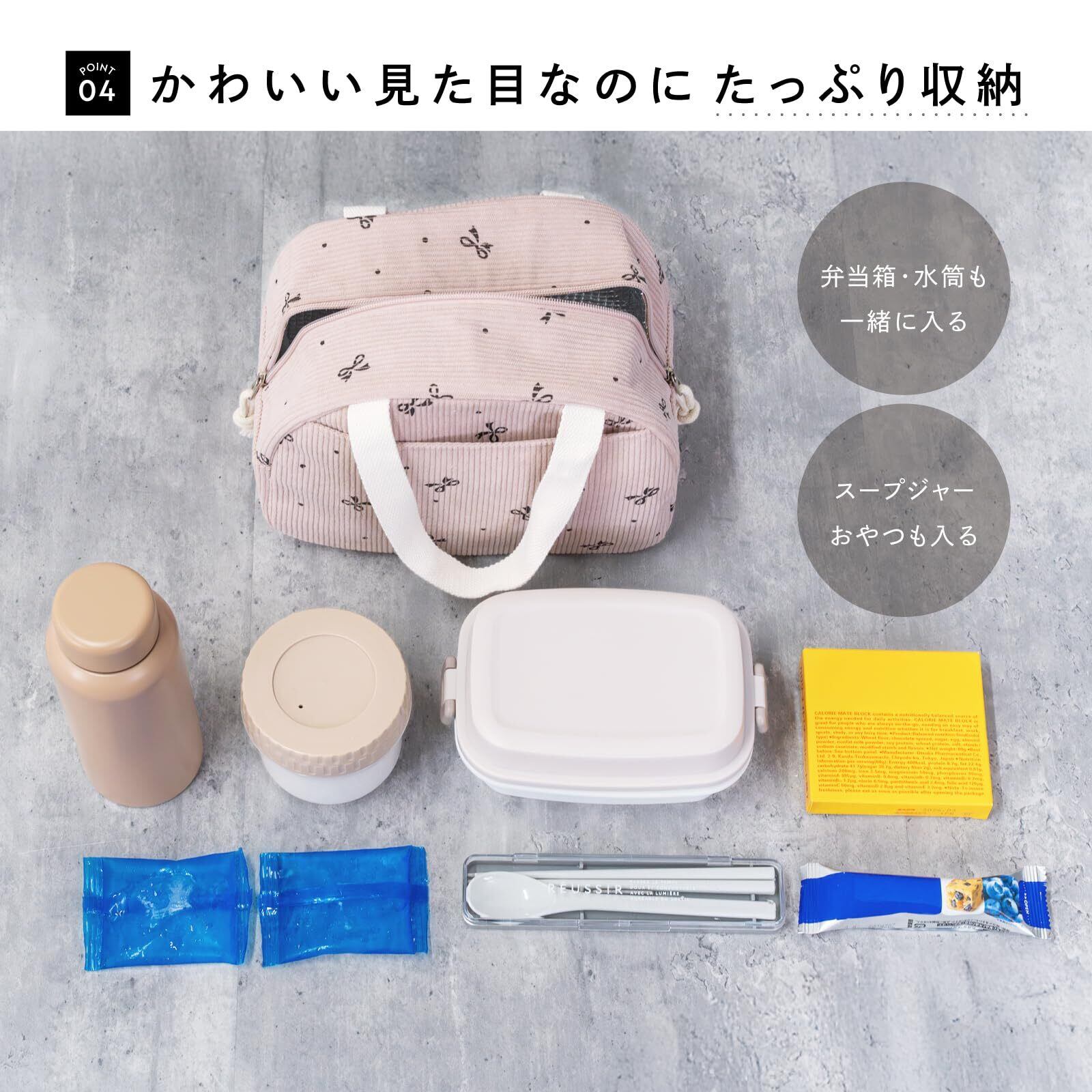 【500mlペットボトルは入りますか?】500mlのペットボトルは余裕を持って横に寝かせて収納可能です。立てて入れることもできますが、500mlでも、背の高いタイプの場合は少し上部が膨らんだ形になります。ただし、ファスナーはしっかり閉めることが可能です。【サイズは小さくないですか?】Petit Bonbonは標準的なサイズのお弁当箱・スープジャー・500mlペットボトル・保冷剤がすっきり収まるコンパクト設計です。荷物が多い方にはサブバッグとの併用もおすすめです。