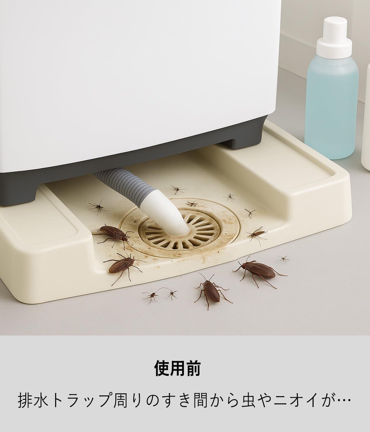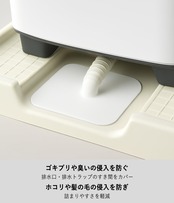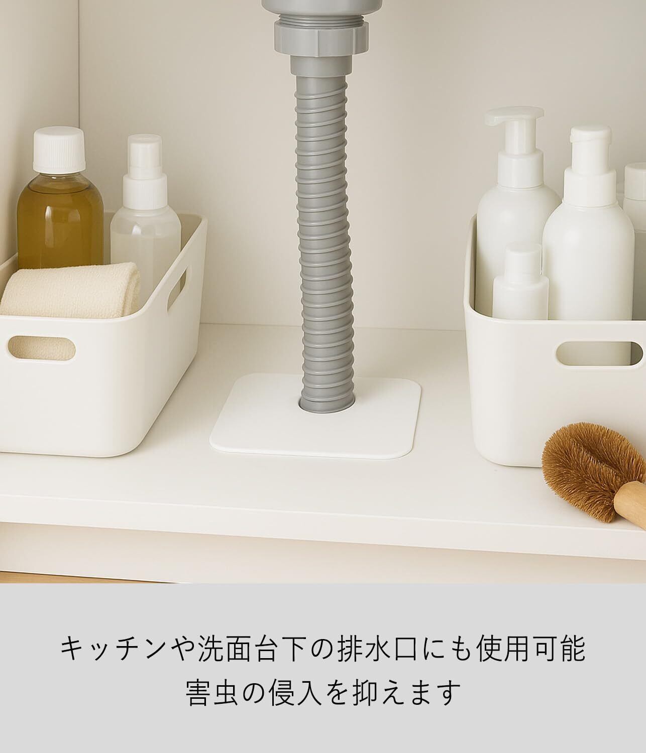 害虫・臭い・ホコリを軽減:排水口や防水パンの排水トラップ周辺にある隙間を覆うことで、ゴキブリなどの害虫や嫌な臭いが室内に上がってくるのを抑制。外部からのホコリや髪の毛が排水トラップに溜まりにくく、詰まり対策にもつながります。