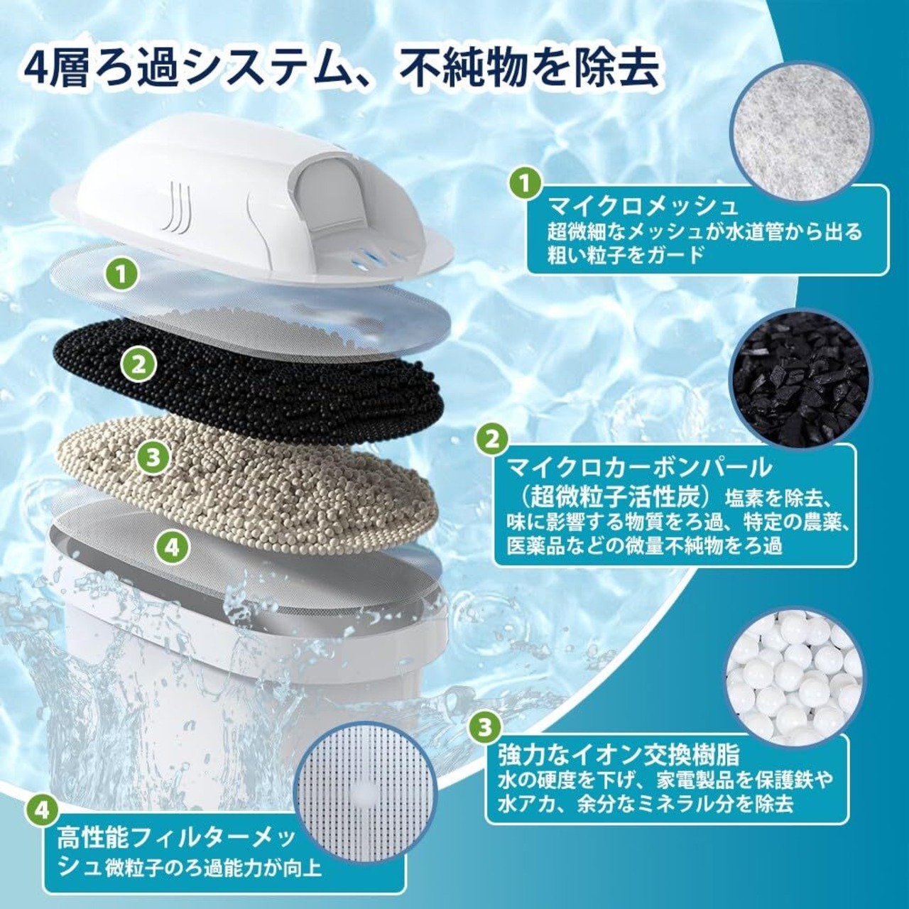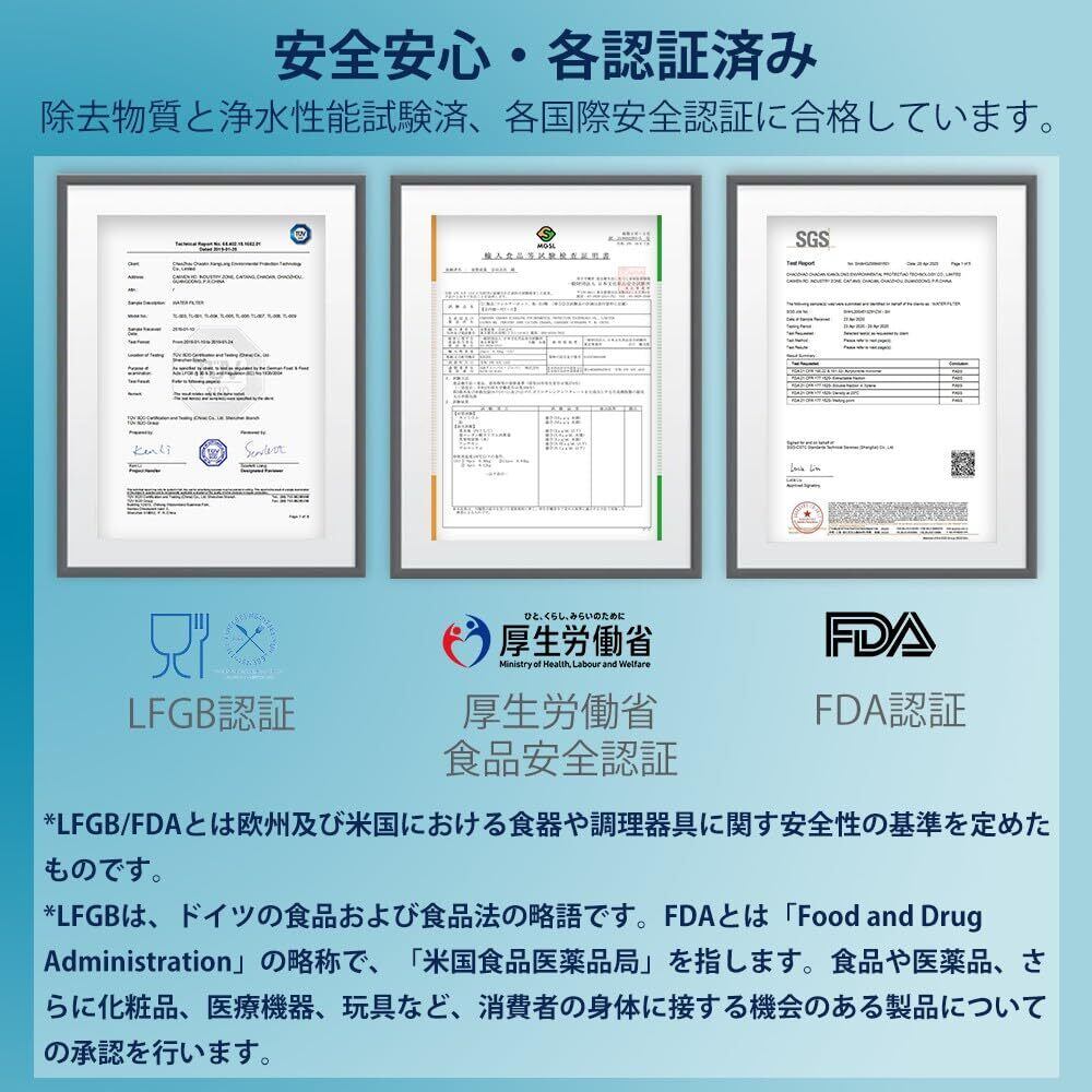 【除去物質・浄水性能試験済】砂など細かな粒子、水アカ、銅や鉛などの重金属、味や臭いを損なう塩素やクロラミンなどの物質を除去、水道水を綺麗で美味しい水に変えます。本製品はFDA認証、LFGB認証、食品安全認証などの国際安全認証に合格しています。どうぞ、安心してお使いください。