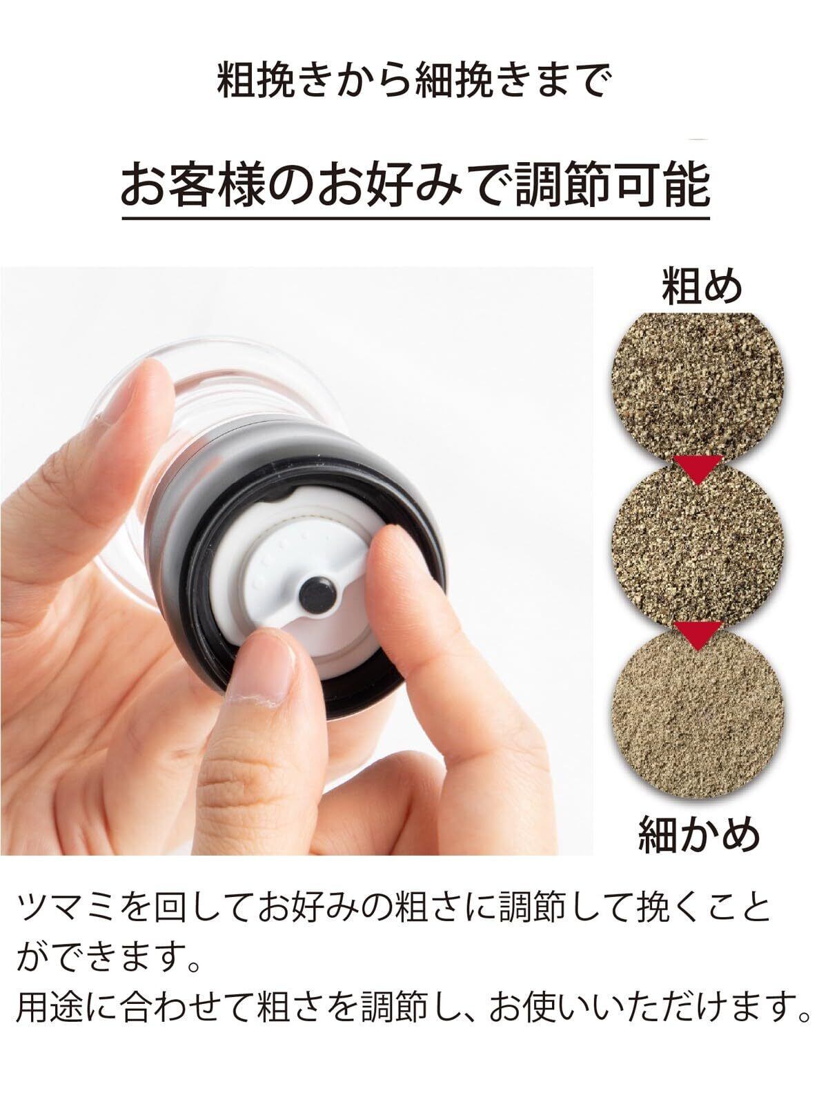 【粗さ調節機能付き】ツマミを回してお好みの粗さで挽くことができる