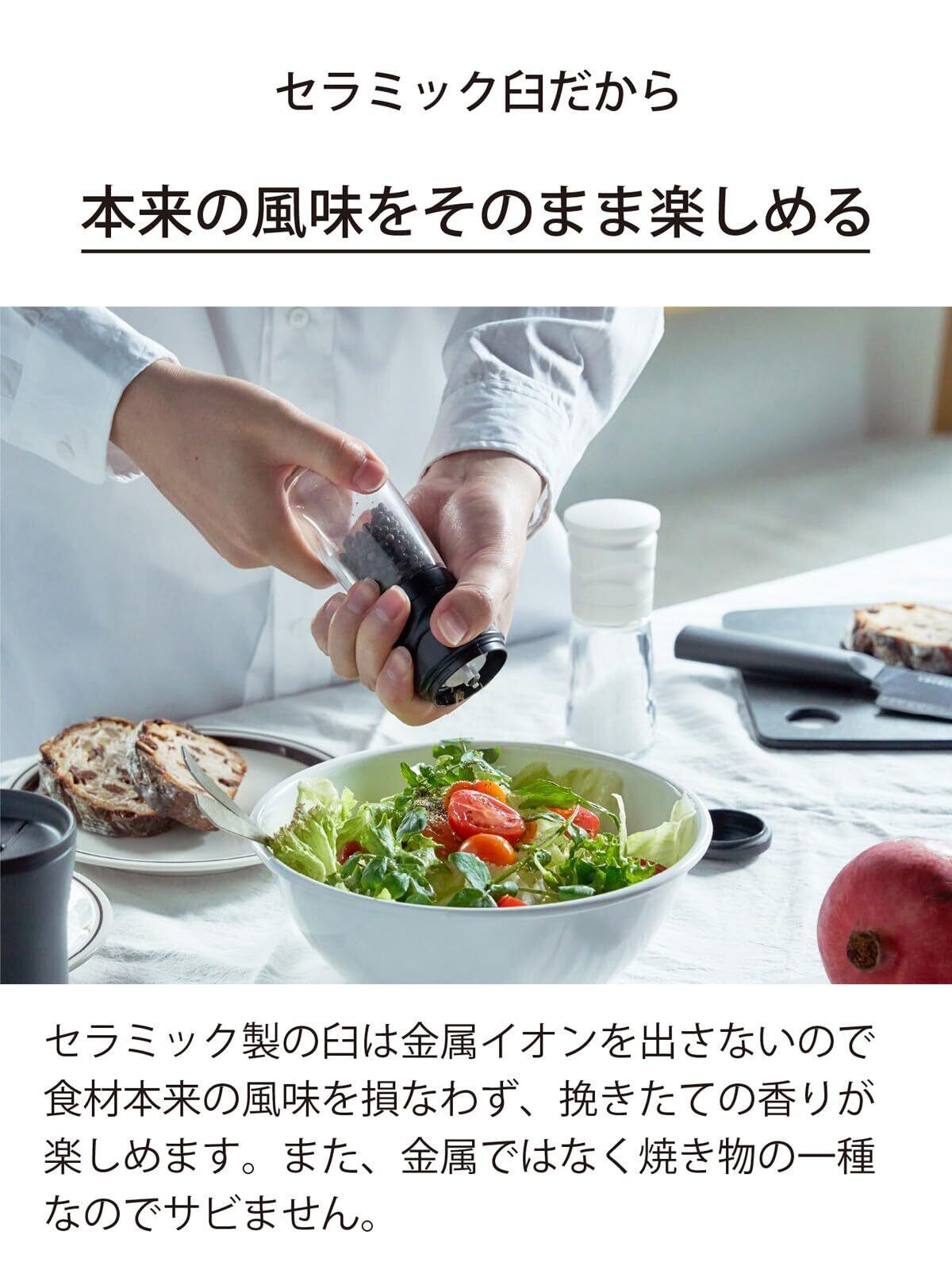 【セラミック製の臼】セラミック刃だからサビずに清潔。金気も出ないので、風味実感!挽きたてを食卓に
