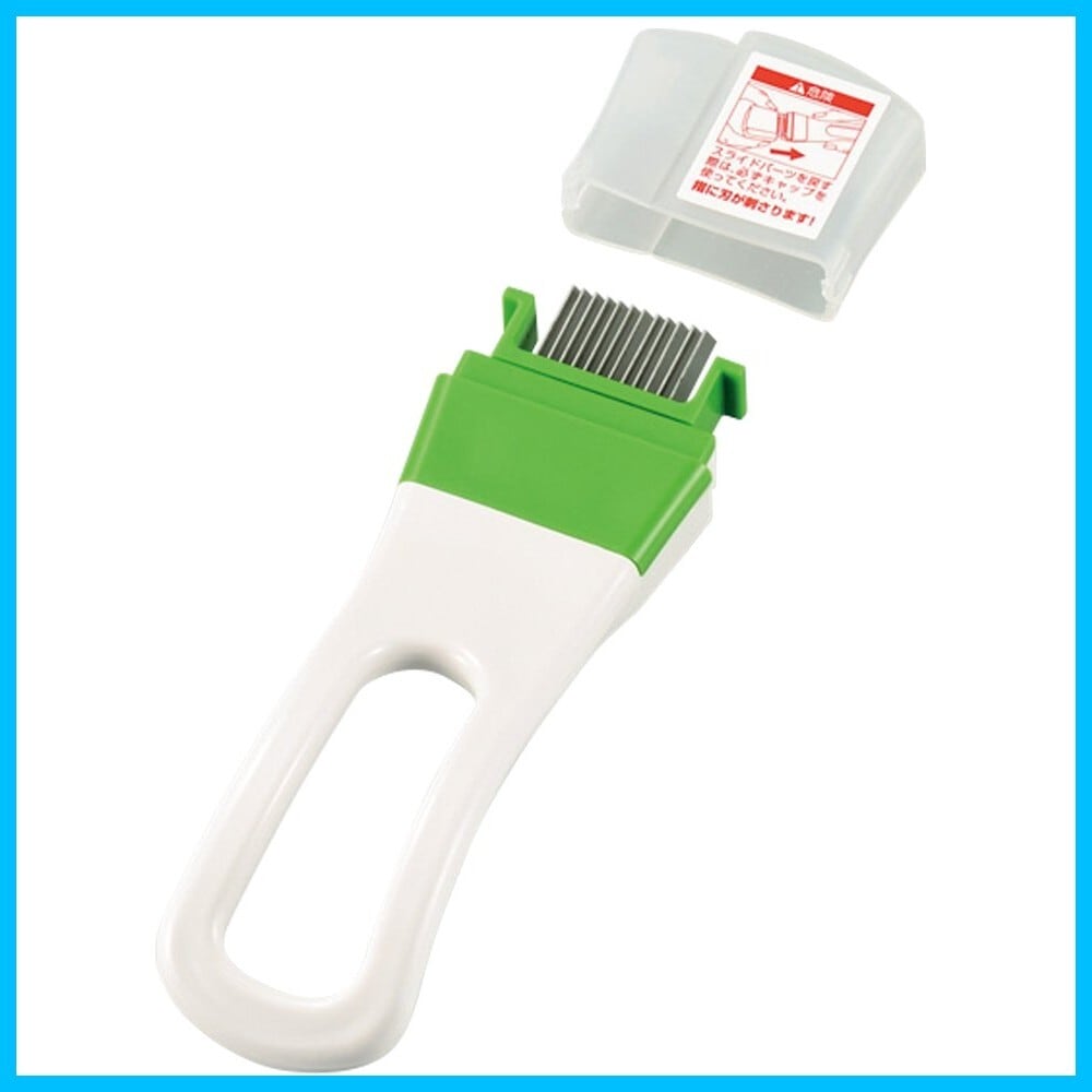 ラクラク! サッと引くだけ、白髪ネギ!サット引くだけでカンタンに白髪ねぎができる。スライドストッパーで刃のすき間のめずまりも解消。キャップ付きで安全収納!