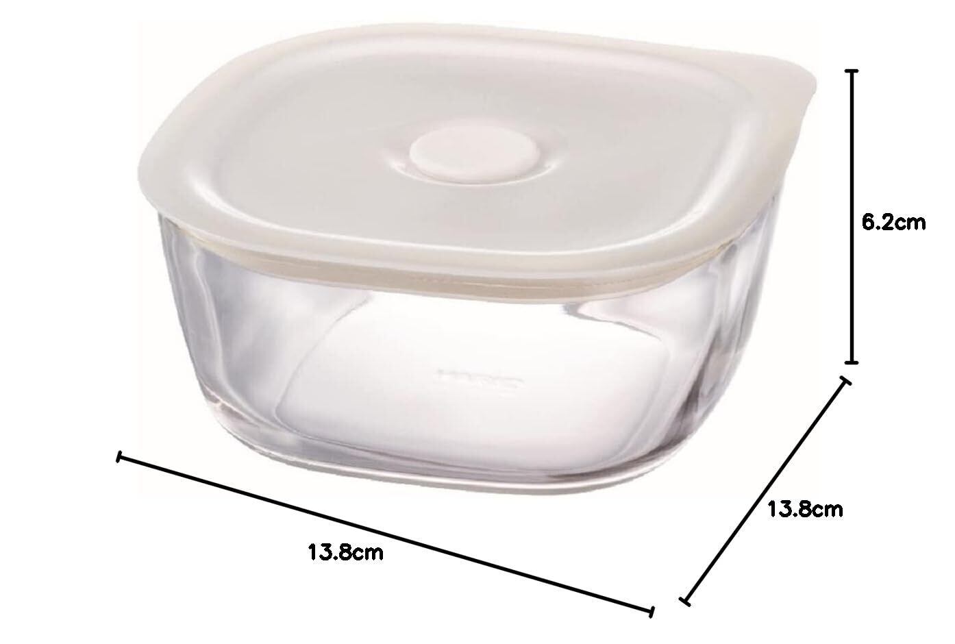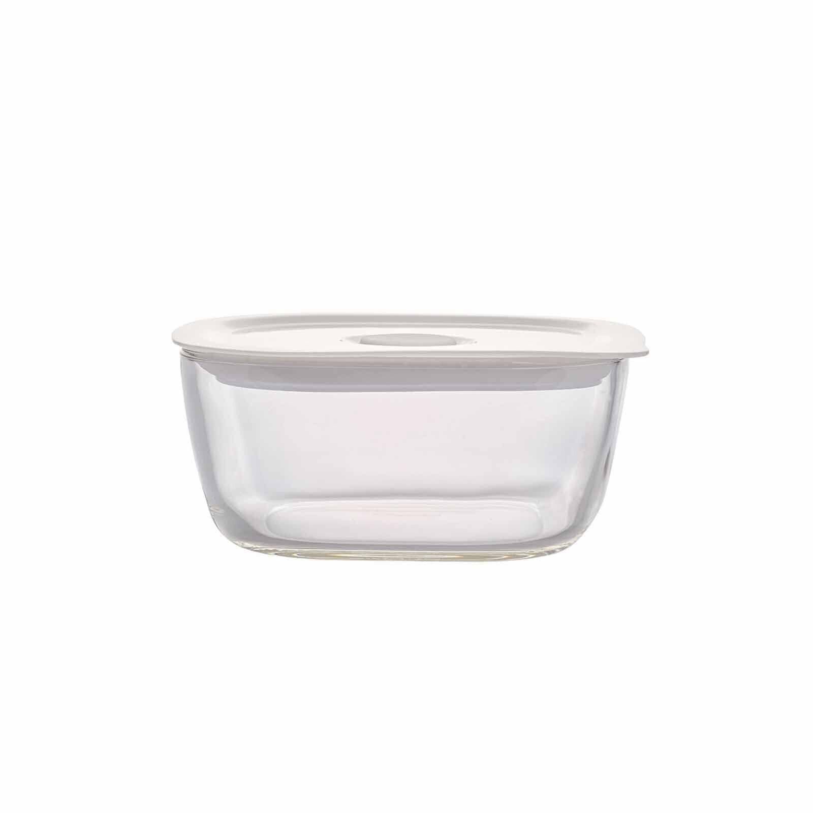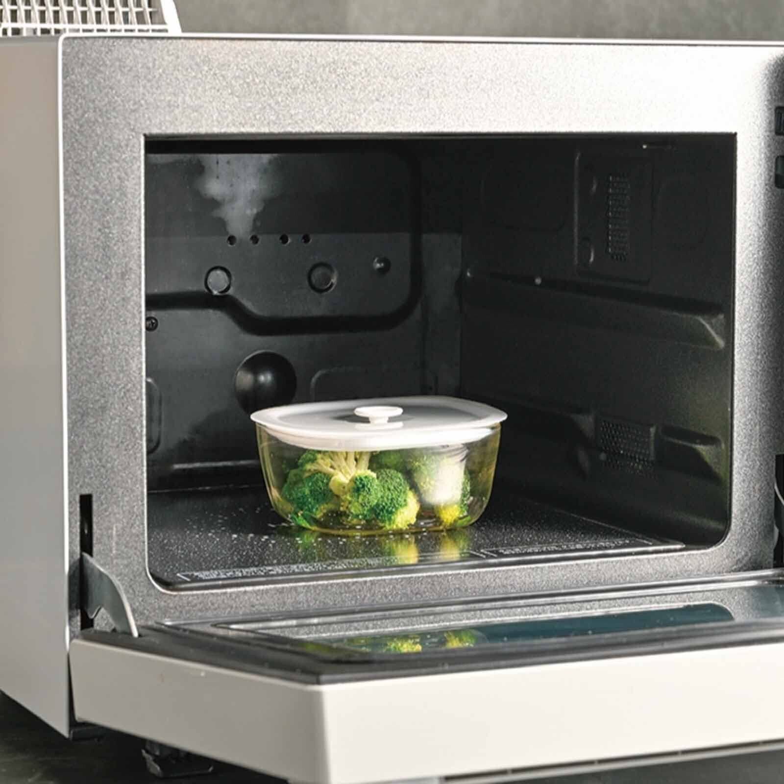 パッキン付きのフタで密閉性の高い、耐熱ガラス製の保存容器。フタの空気弁を上に引き上げると電子レンジでの使用が可能