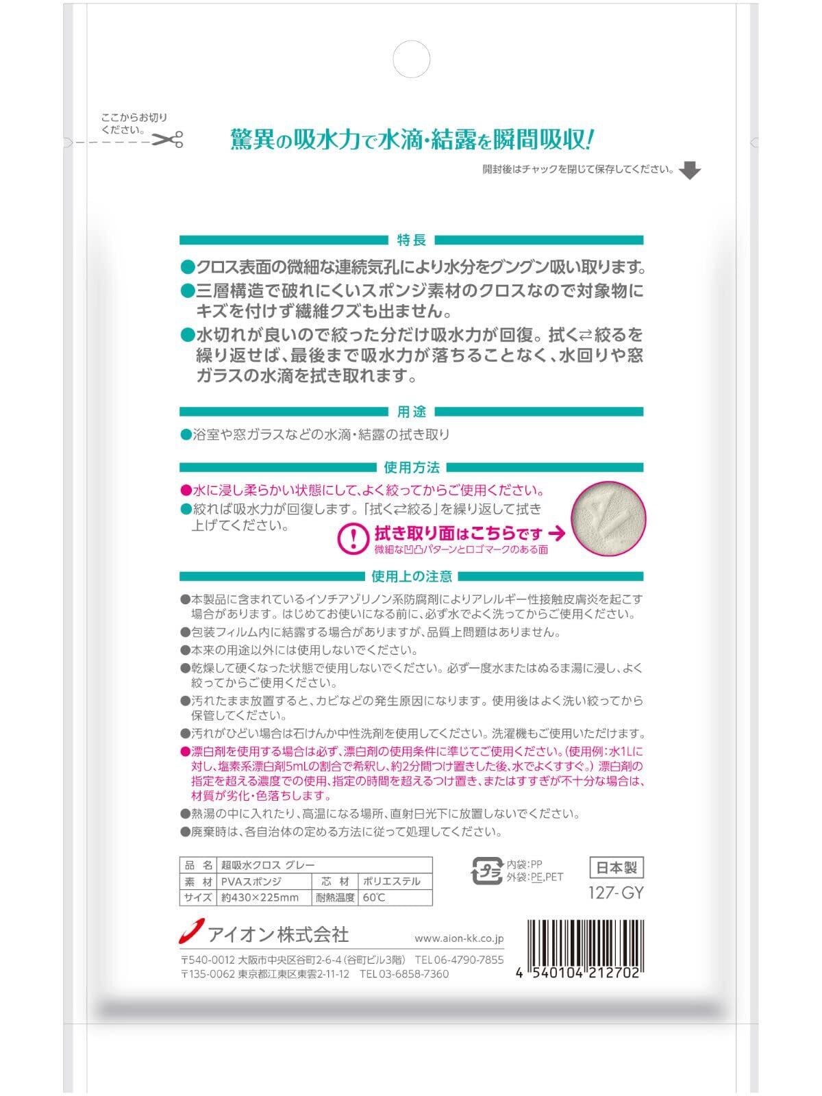 アイオン(Aion) 超吸水クロス グレー 最大吸水量 約140ml 1枚入 日本製 PVA素材 絞ればすぐに元の吸水力復活 結露対策 水滴ちゃんとふき取り 127-GY