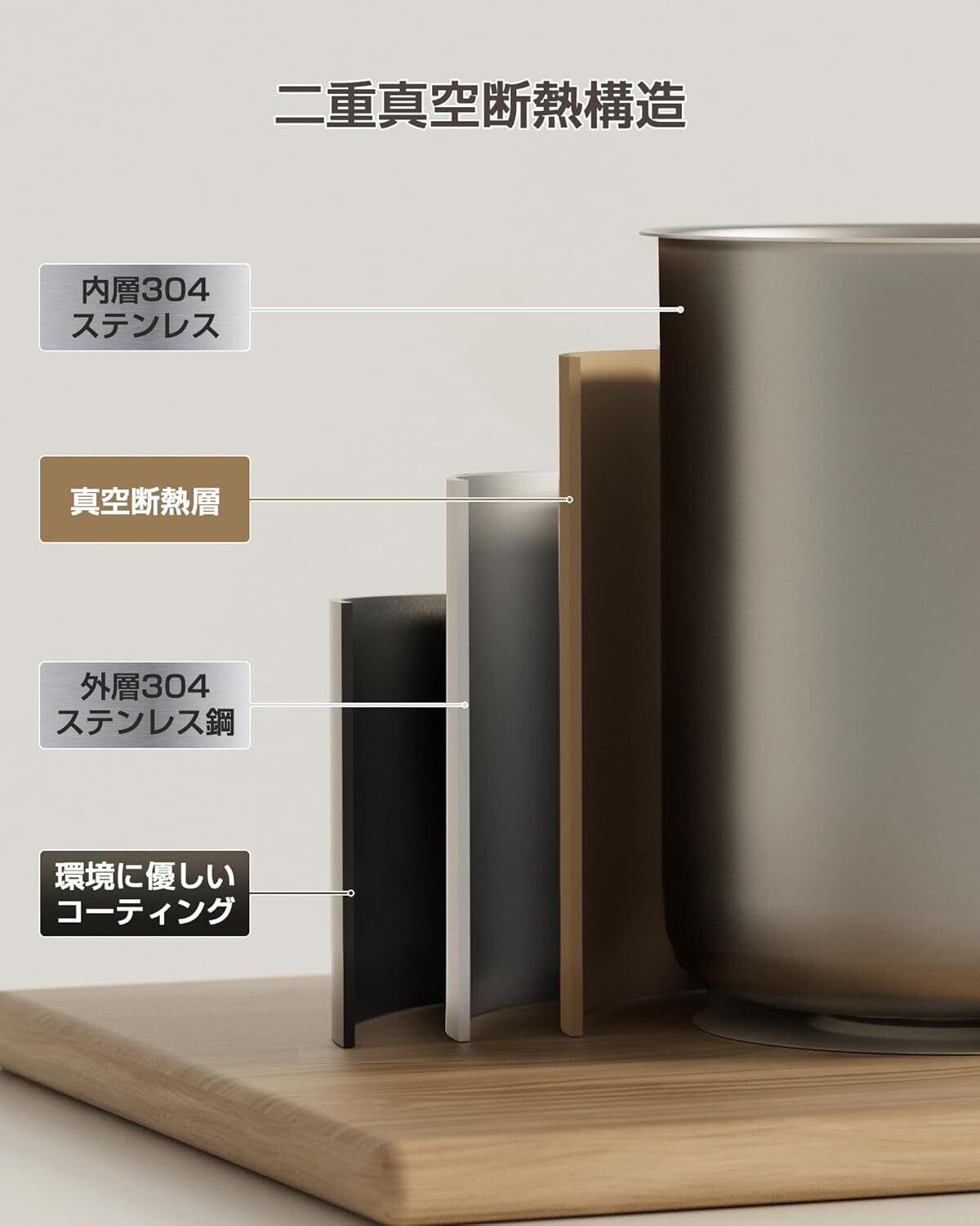 【二重構造・真空断熱】このコーヒーカップは、従来の魔法瓶を超える真空断熱構造を採用しており、外部との熱交換を完全に防ぎます。そのため、保温と保冷の両方が可能です。また、真空断熱構造により、カップの外側に結露ができて水滴が滴ることを防ぎ、手が汗で濡れることもありません。熱い飲み物を入れても外側が熱くならず、蓋付きマグカップを安心して持つことができ、火傷の心配もありません。