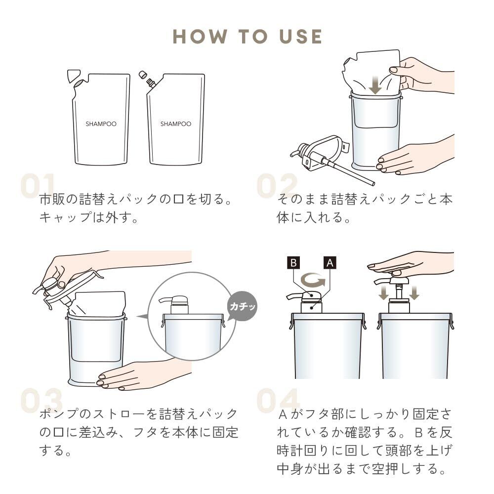 【詰替え簡単ディスペンサー】シャンプーなどの詰替えに便利なディスペンサー。詰替えパックがそのまま入るから、面倒な補充も手間いらず簡単!