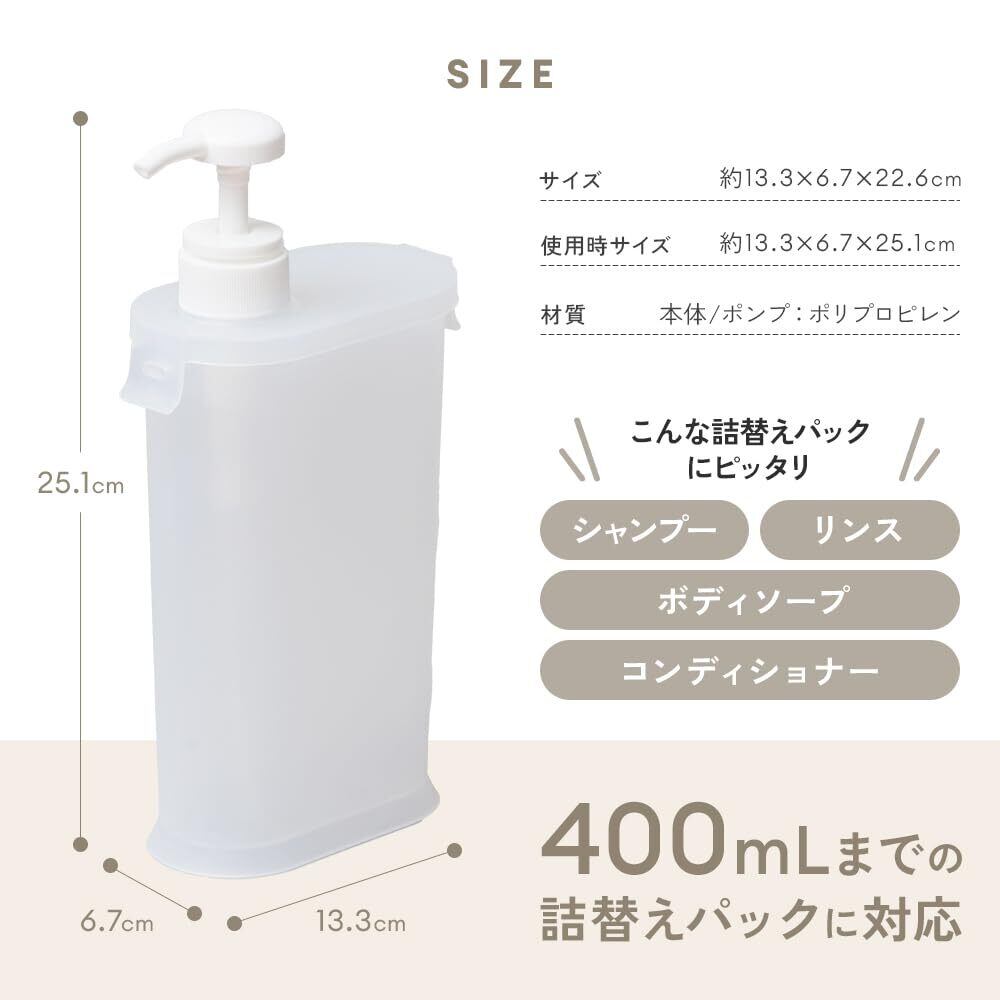 【商品仕様】商品サイズ/本体:(約)13.3×6.7×22.6cm(使用時:約13.3×6.7×25.1cm)、適応サイズ/400mLまでの詰替えパック、材質/本体:ポリプロピレン・ポンプ:ポリプロピレン