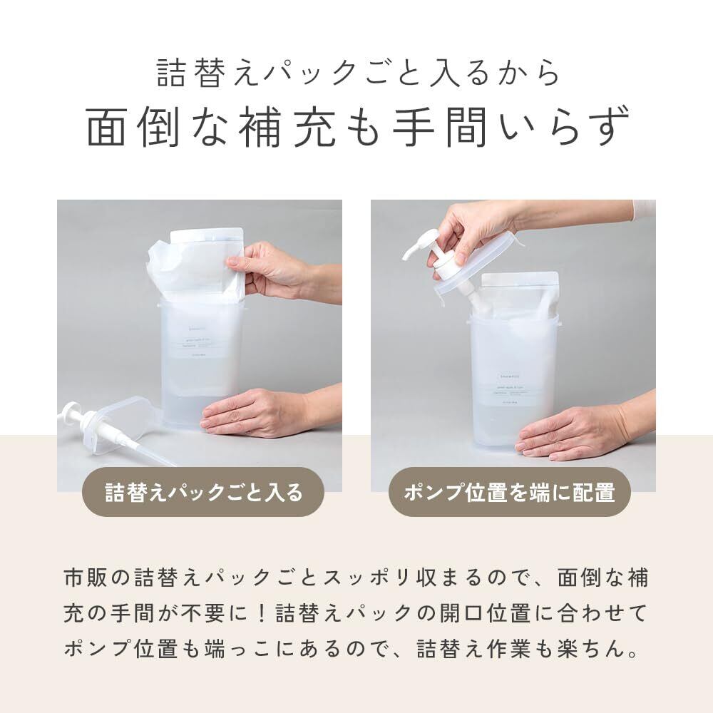 詰替えパックごとスッポリ!シャンプーなどの詰替えに便利なディスペンサーです。詰替えパックの開口位置に合わせてポンプの位置が端にあるため、詰替え作業が簡単に行えます。スリムな設計でスペースをとらず、浴室もスッキリ。底面には水抜き穴があり、水が溜まらずお手入れも簡単です。400mLまでの詰替えパックに対応。