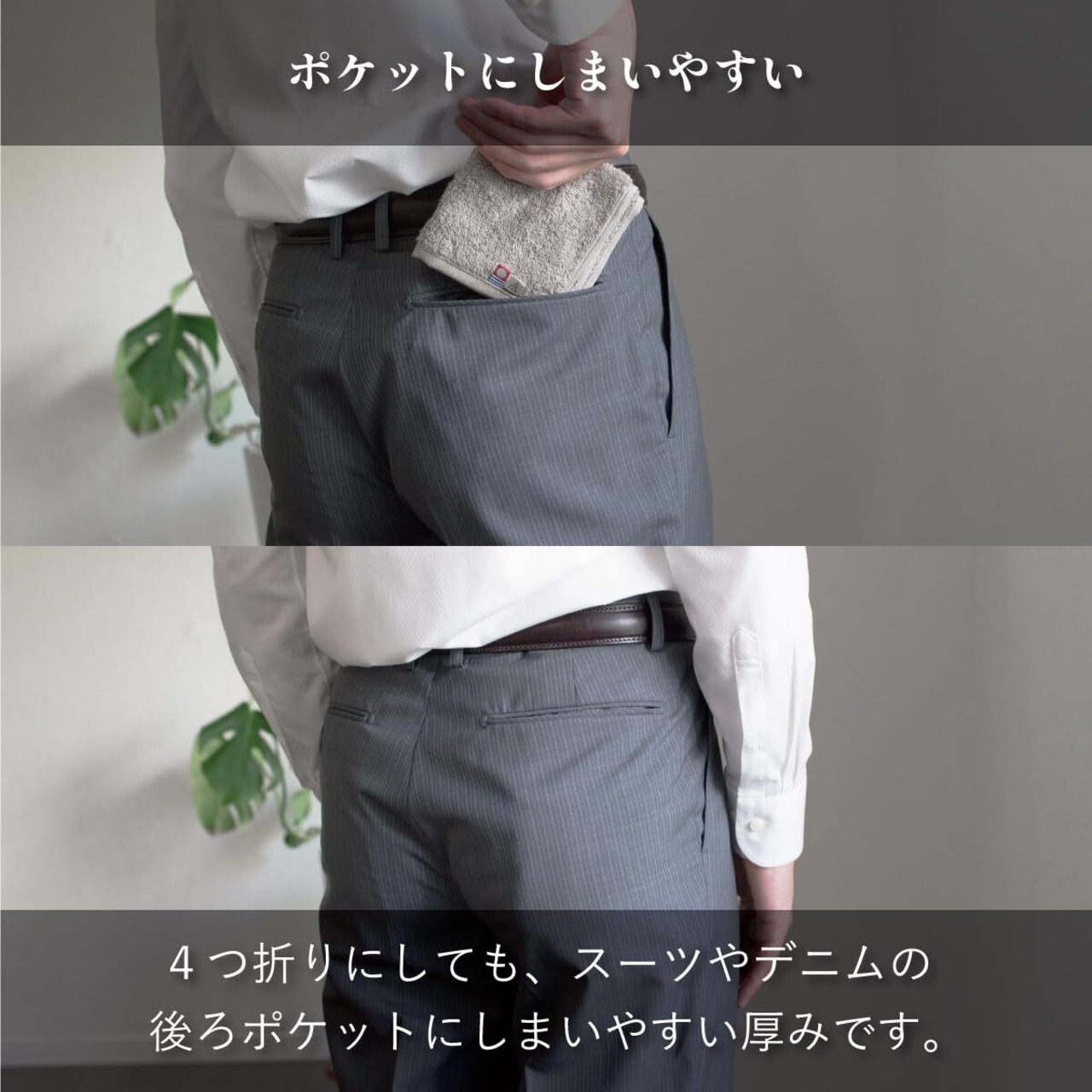 一日中使ってもしっかりと吸収してくれるパイル。ズボンのポケットにもはみ出さず収まってくれる大きさ。