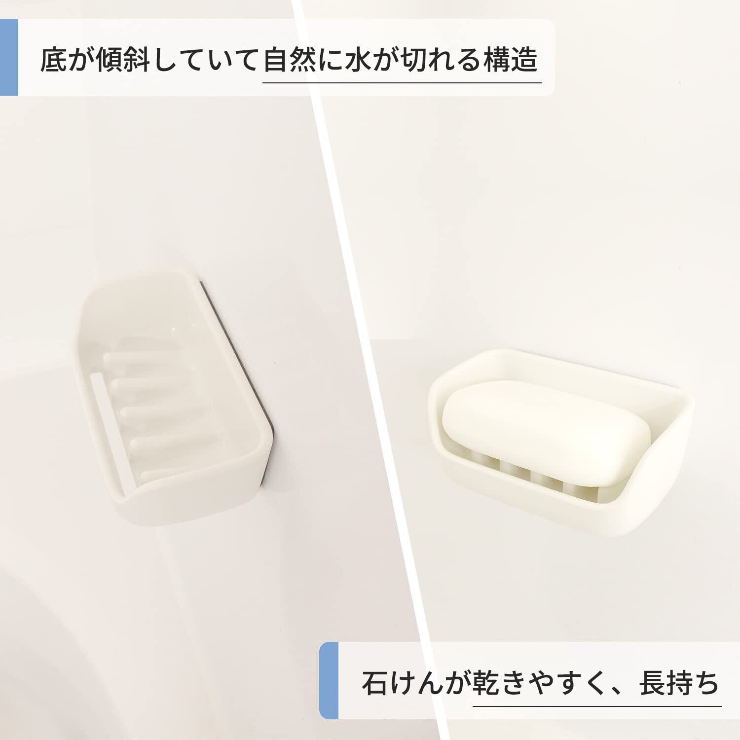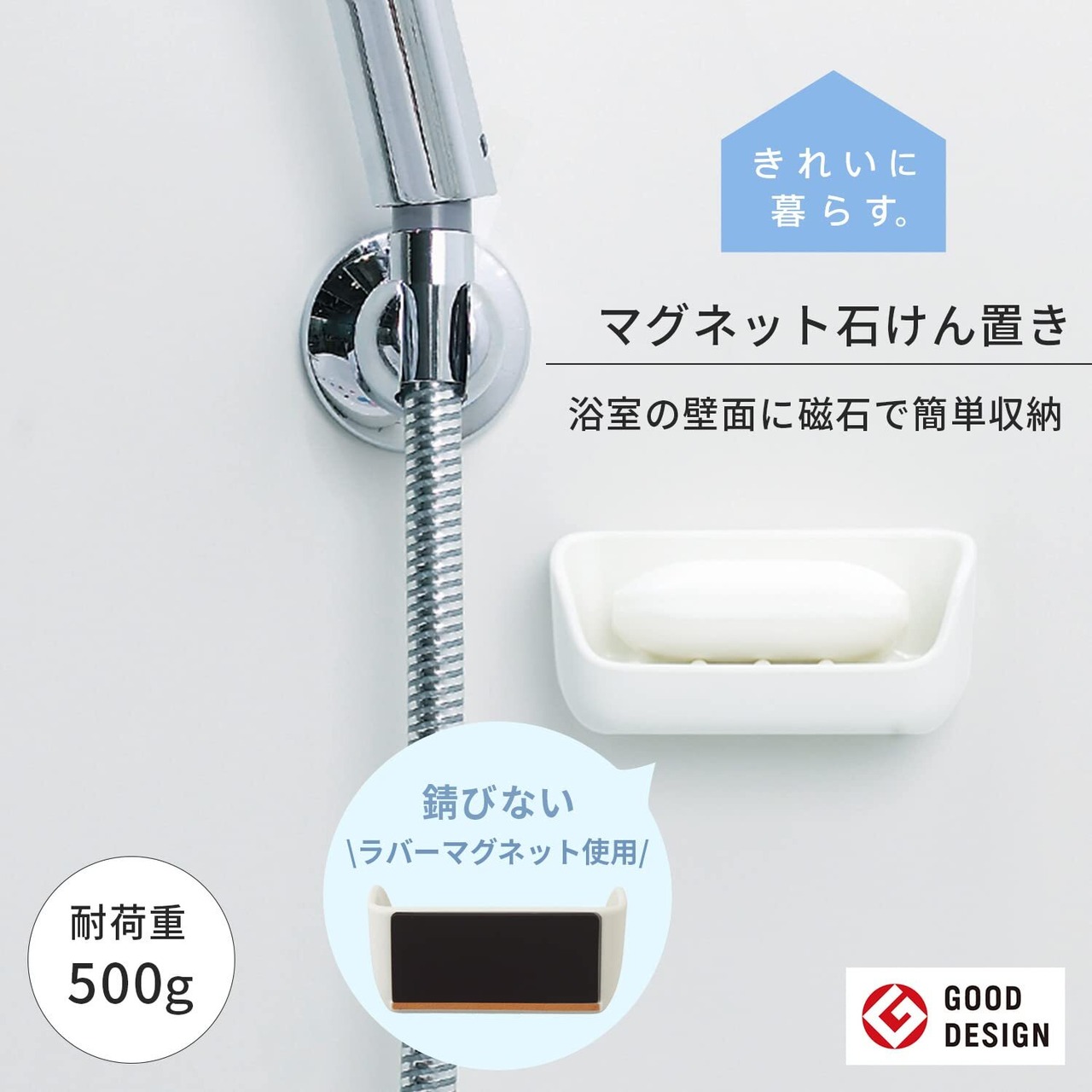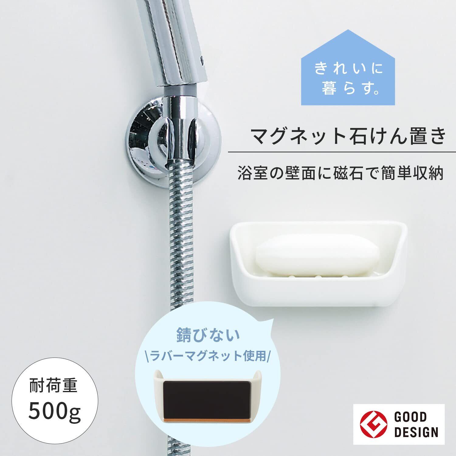 【磁石でくっつく石けん置き】GOOD DESIGN賞受賞(※)。磁石付きで浴室の壁にくっついて、場所を取らずに浮かせて収納できる石けん置きです。底が傾斜しており自然に水が切れるので、石けんが乾きやすく、長持ちします。(※2019年受賞)