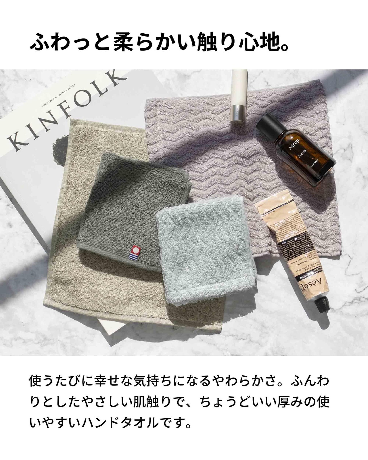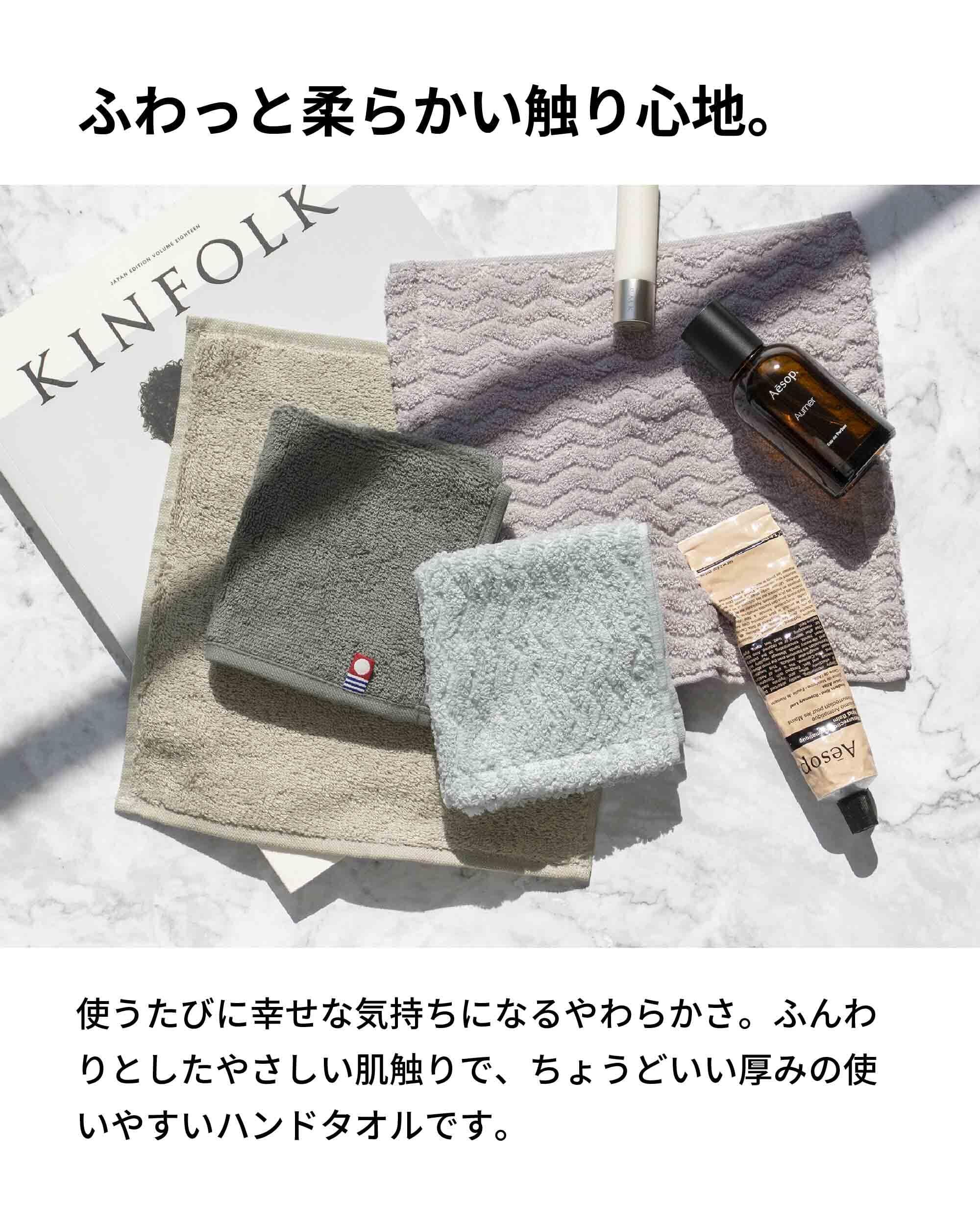 ふわっと柔らかい触り心地。使うたびに幸せな気持ちになるやわらかさ。ふんわりとした優しい肌触りで、ちょうどいい厚みの使いやすいハンドタオルです。