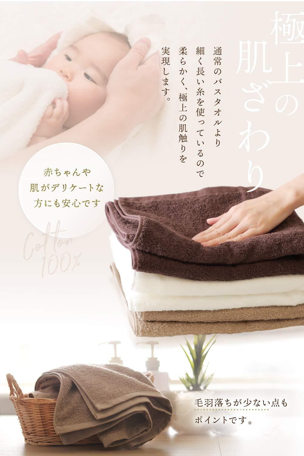 通常のバスタオルより細く長い糸を使っているので、柔らかく、極上の肌ざわりを感じていただけます。毛羽落ちが少なく、赤ちゃんや肌がデリケートな方にも安心です。吸水性にもすぐれているので、薄手でもしっかりと体全体を拭くことができます。