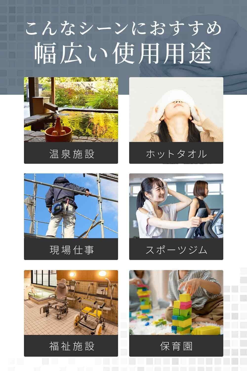 【様々な用途で使える万能フェイスタオル】一般的なフェイスタオルよりも少し長めの設計にしたことで、一般的なデイリーユーズから旅館・ホテル・レストラン等の業務用、災害時の備えとして様々な用途で使用できる万能なフェイスタオル