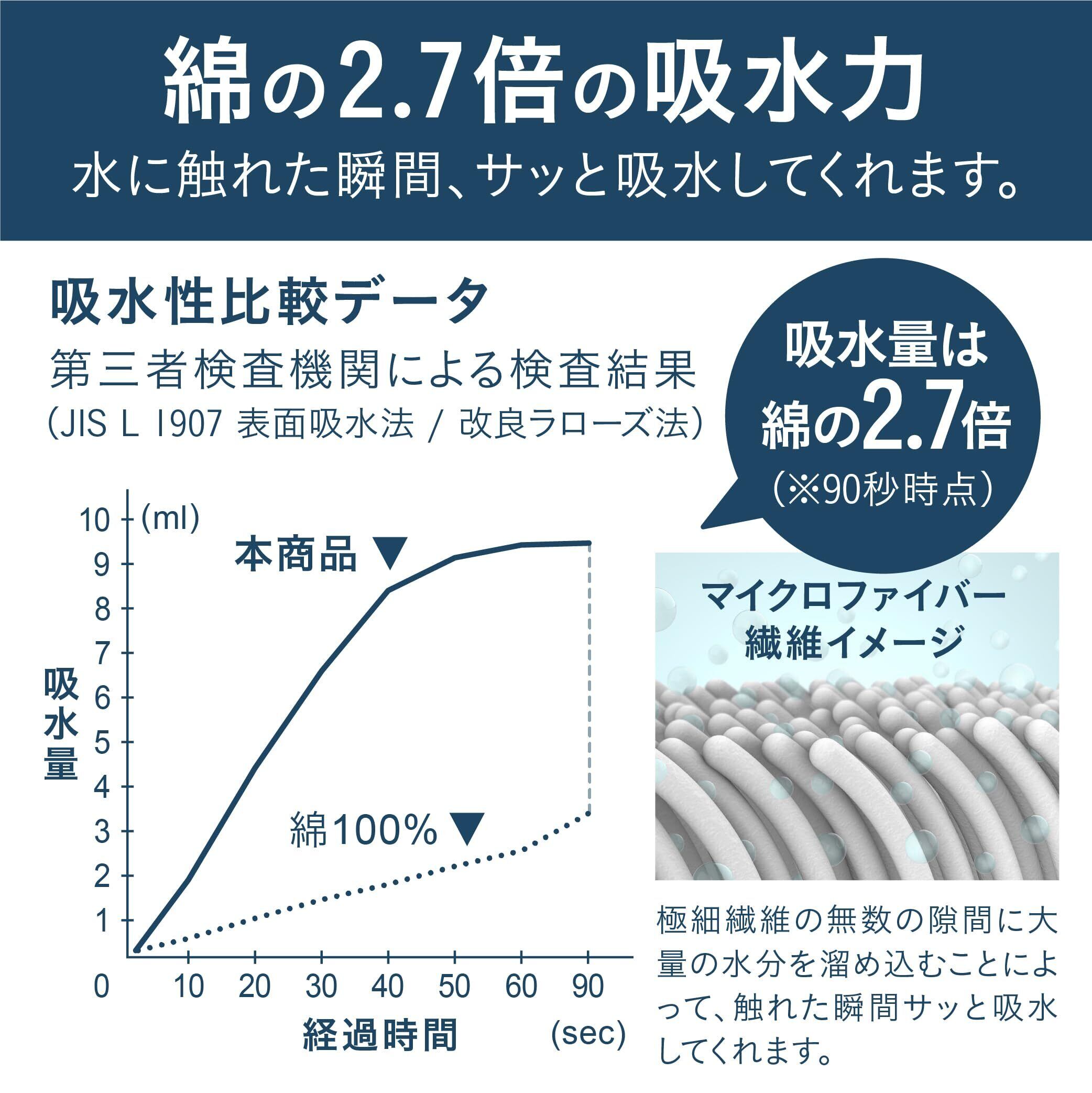 極細のマイクロファイバー繊維が無数の隙間で水分をぐんぐん吸収してくれるマイクロファイバーバスマット。吸水量は綿の2.7倍で、毎回さっぱり気持ちよく使えます※第三者検査機関による検査結果