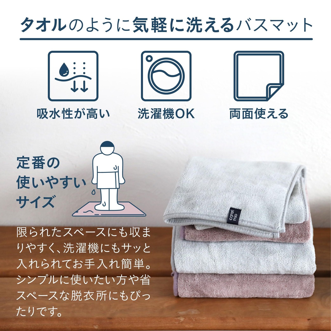ジメジメした梅雨時期や真冬の洗濯でも乾きやすいので、タオルみたいに気軽に洗って使えます。ふんわり優しい肌触りだけでなく、清潔感のある色味とやわらかな質感で、脱衣所の雰囲気を明るく整えます。生活感を抑えたシンプルデザインだから、家族みんなが気持ちよく使えるバスマットです