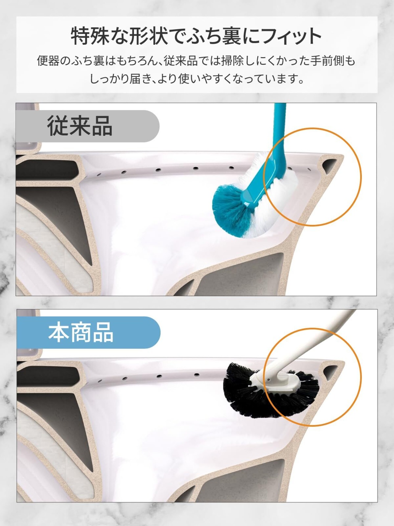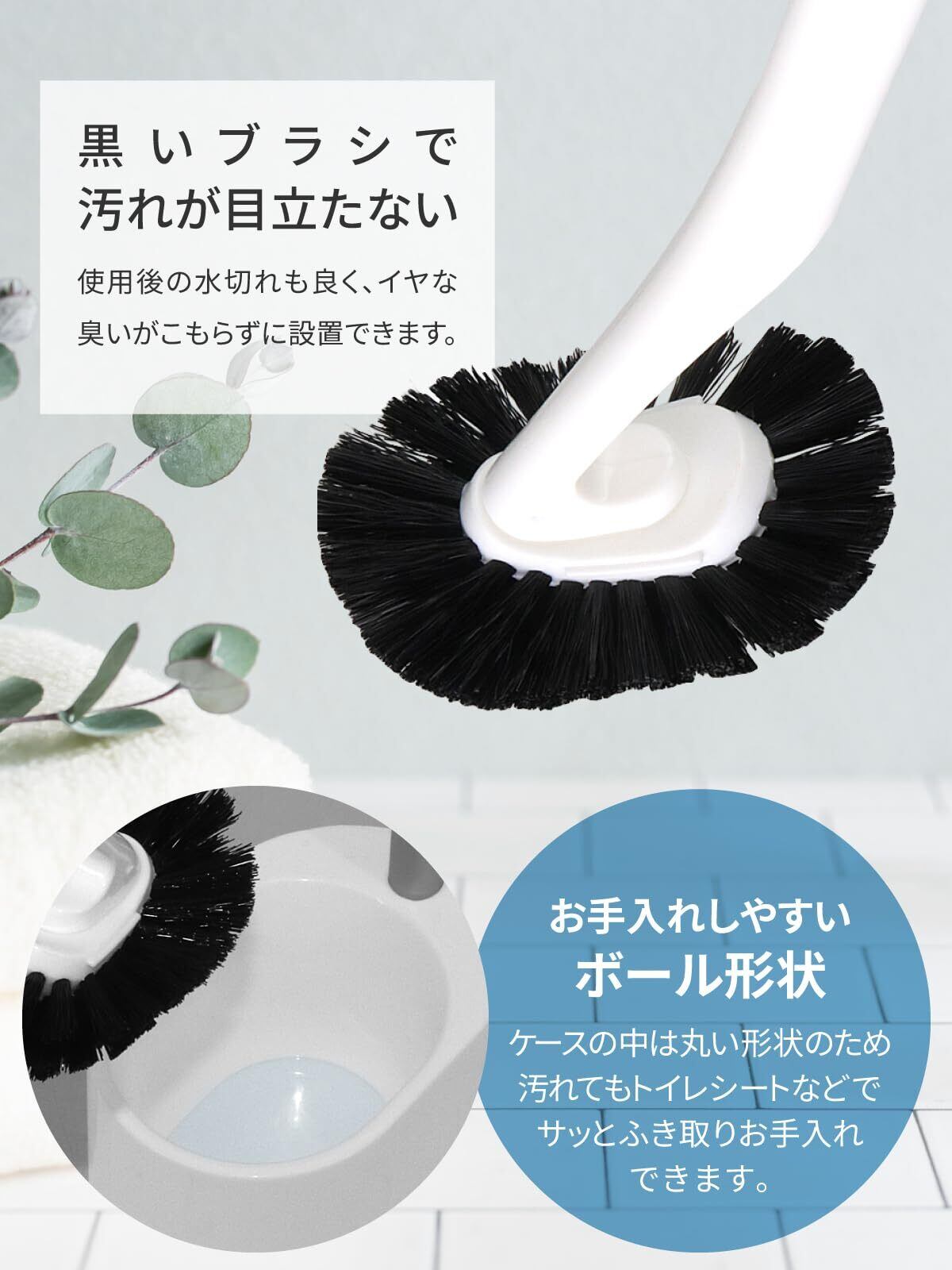 ブラシ部は便器フチ裏を洗いやすい形状にし、毛は汚れの目立たない黒毛を使用しています。